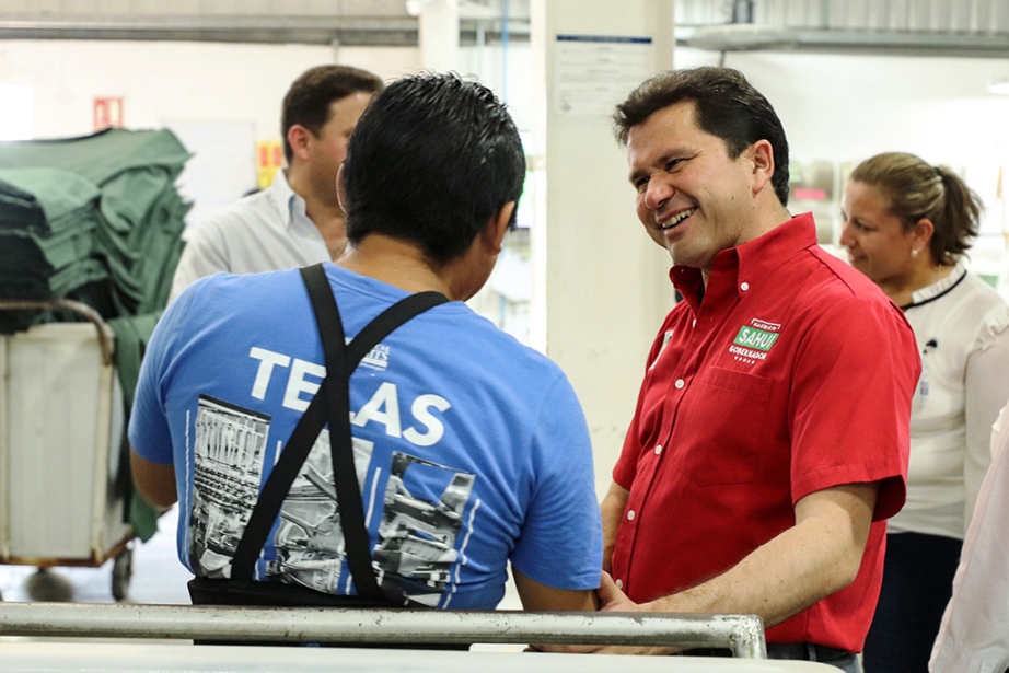 Acompañado de los propietarios de la planta en la que laboran más de mil 700 personas, Jorge y Omar Kuri Achach, Sahuí Rivero conoció el departamento de serigrafía compuesto por las áreas de Arte, Cuadros, Tintas, Desarrollo, Innovación y Producción.