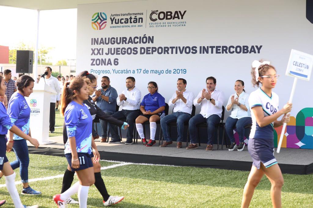 En ese marco, el Gobernador, acompañado del director de los Colegios de Bachilleres de Yucatán (Cobay), Marco Antonio Pasos Tec, dio la patada inicial que puso en marcha los Juegos Deportivos Intercobay en la zona 6, donde participarán 518 deportistas de los planteles de Progreso, Caucel, Celestún, Cholul, Hunucmá, Kanasín, Kinchil, Seyé.