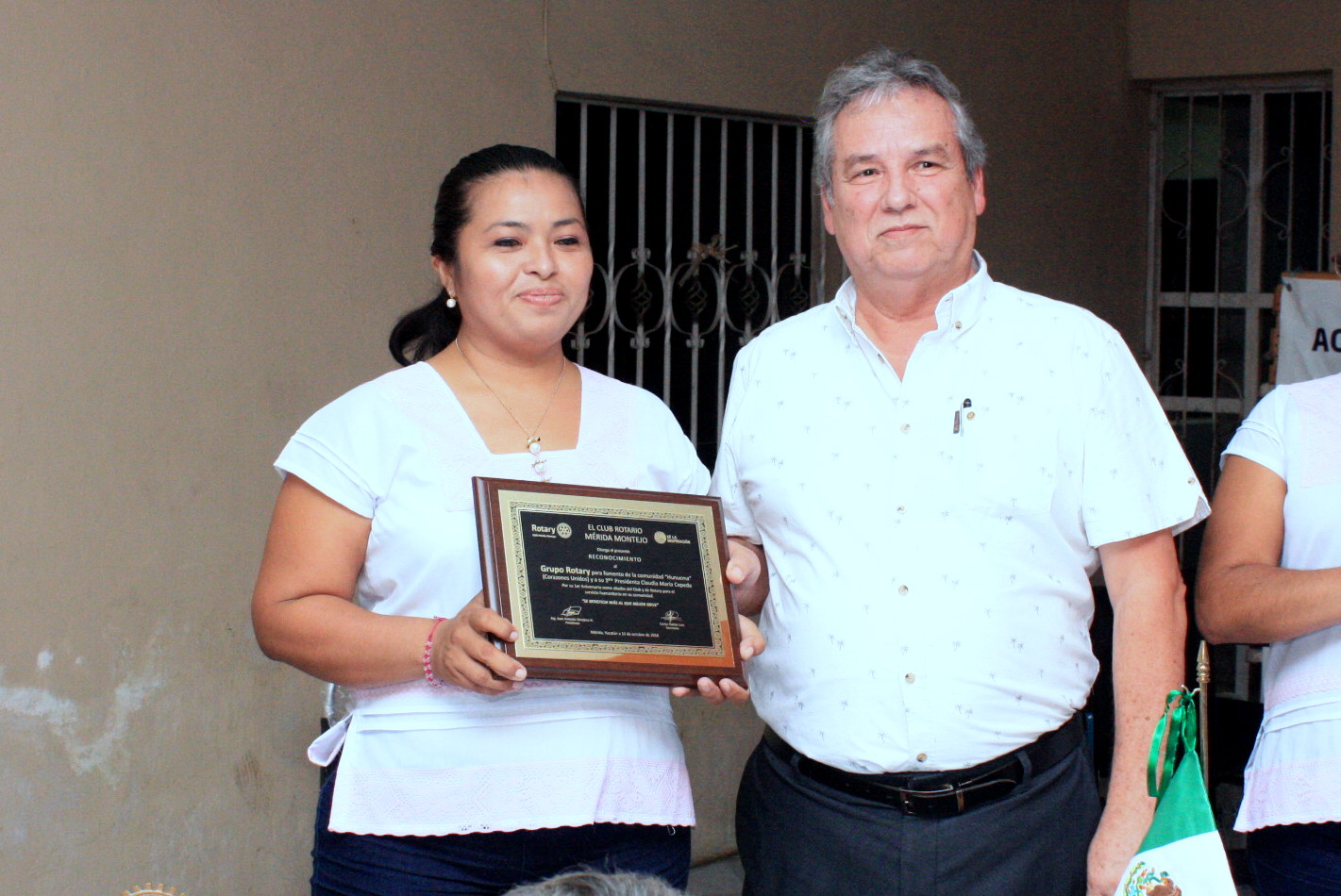 Al vicepresidente del club y director de relaciones públicas del club Rotario el Lic. Miguel Trujequé al PDG. José Vargas Días quien tuvo a su cargo el protocolo de este evento, la presidenta Claudia recibió un reconocimiento del Club Rotario por su buen desempeño al frente del grupo de fomento comunitario en este su primer aniversario, reconocimiento que le entrego el Sr. Juan Hinojosa presidente del Club Rotario.