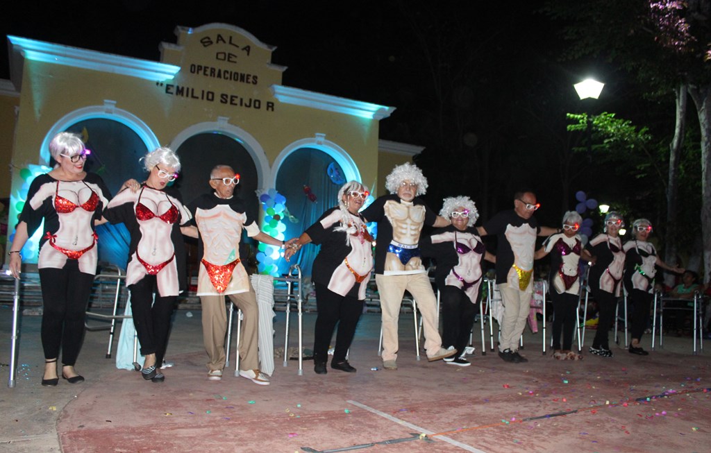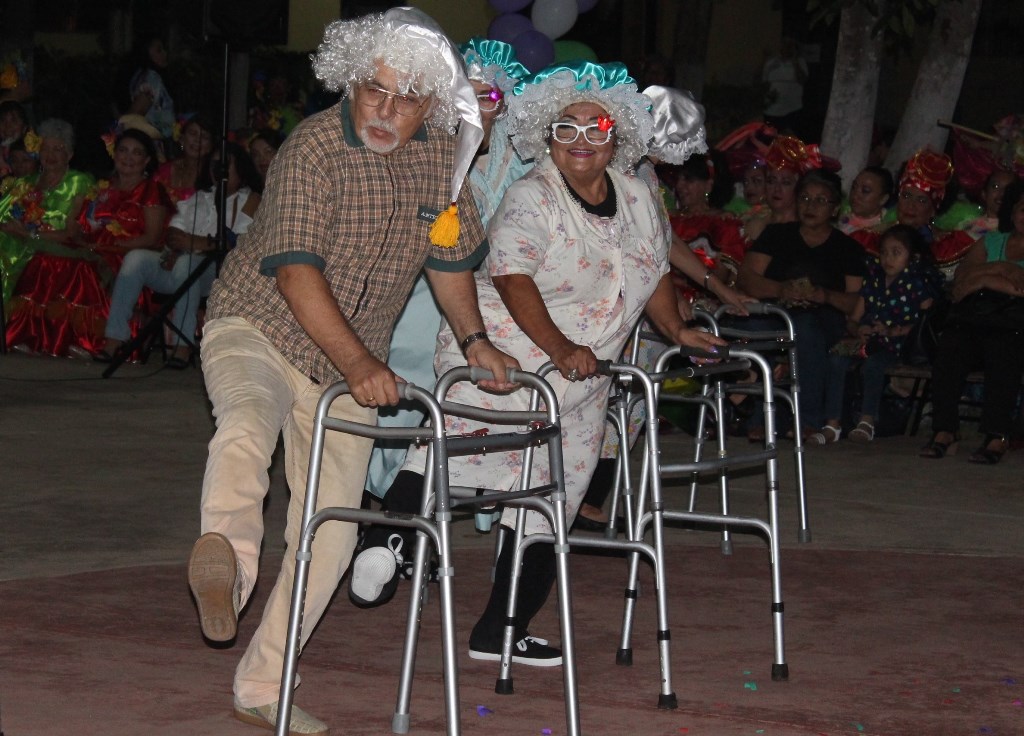 El entusiasmo de la comparsa de la reina y el rey, integrantes del Taller de Teatro que dirige Yatzaret Castillo, se apreció en el espectáculo que incluyó una mezcla de música de las grandes orquestas de los años 40 hasta ritmos modernos con una coreografía que puso a bailar al público.