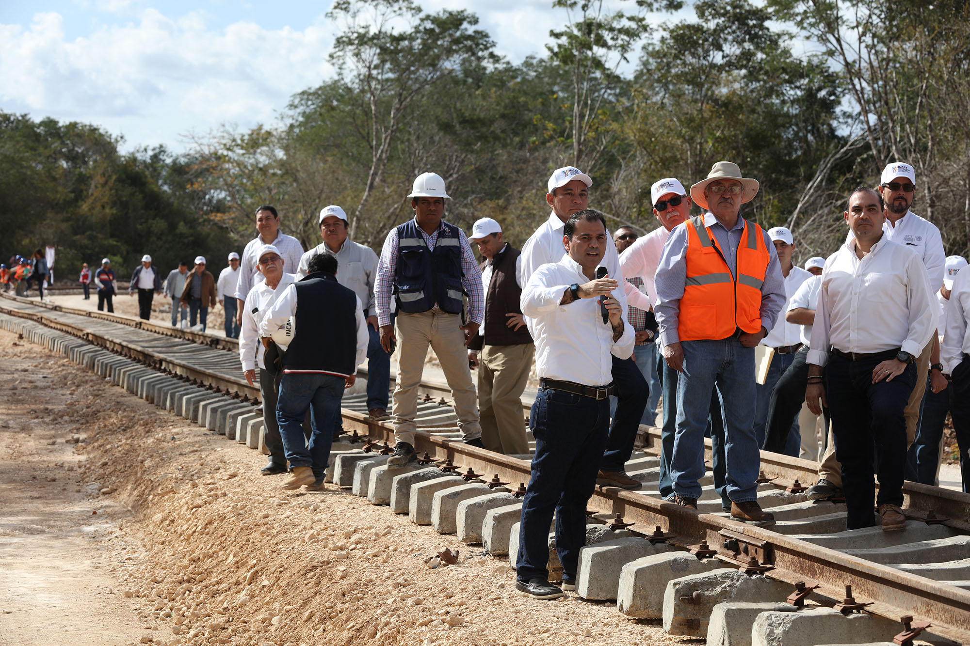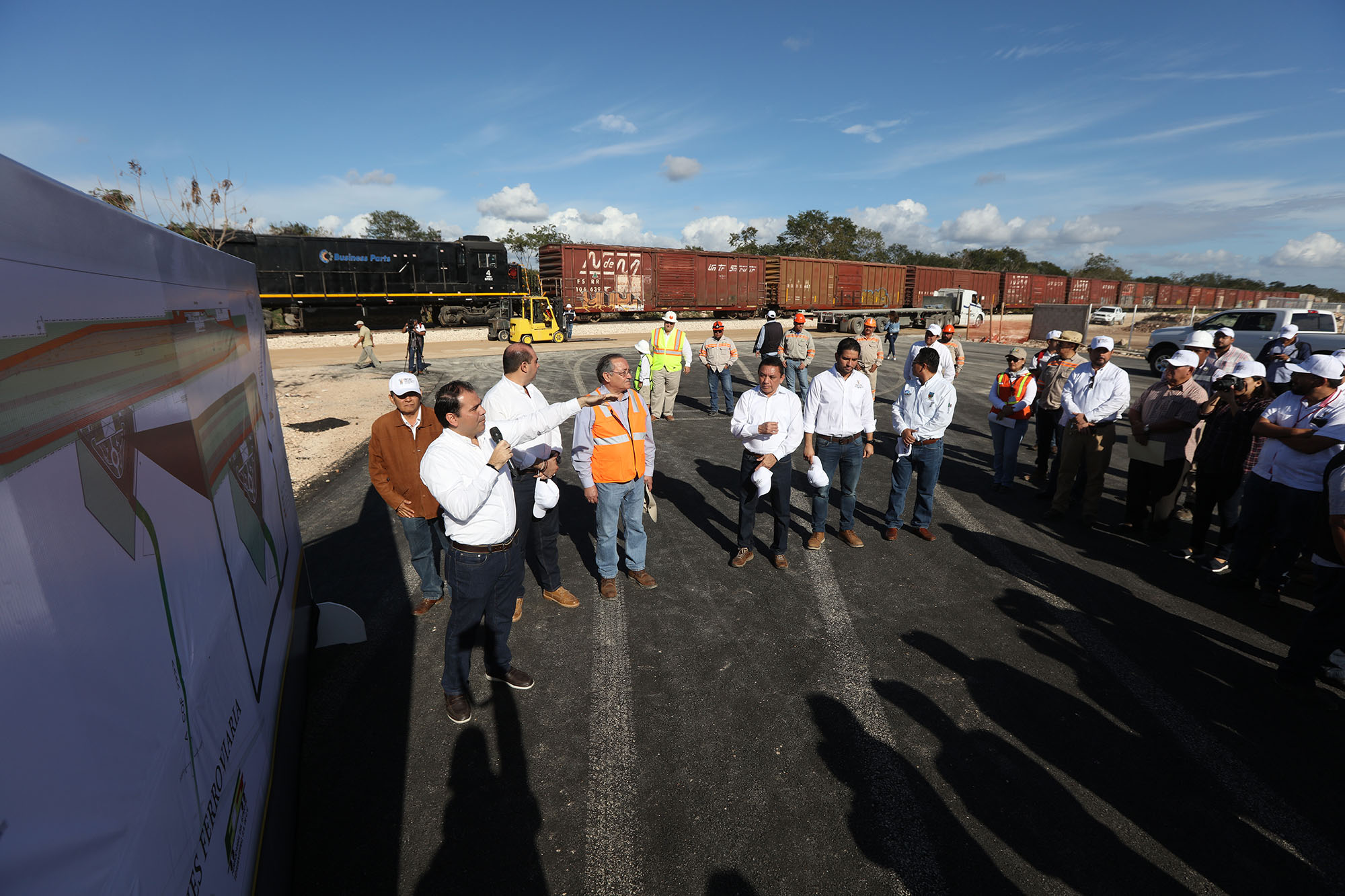 “Las vías ferroviarias tienen una longitud de más de cinco kilómetros, sumando las cinco vías que se construyen en este patio de maniobras. Ya podemos ver la infraestructura con la que cuenta el COF, pues desde el entronque con la antigua carretera Mérida-Campeche que es el acceso, se tiene un camino nuevo pavimentado de siete metros de ancho y 1.2 kilómetros de longitud”, puntualizó.