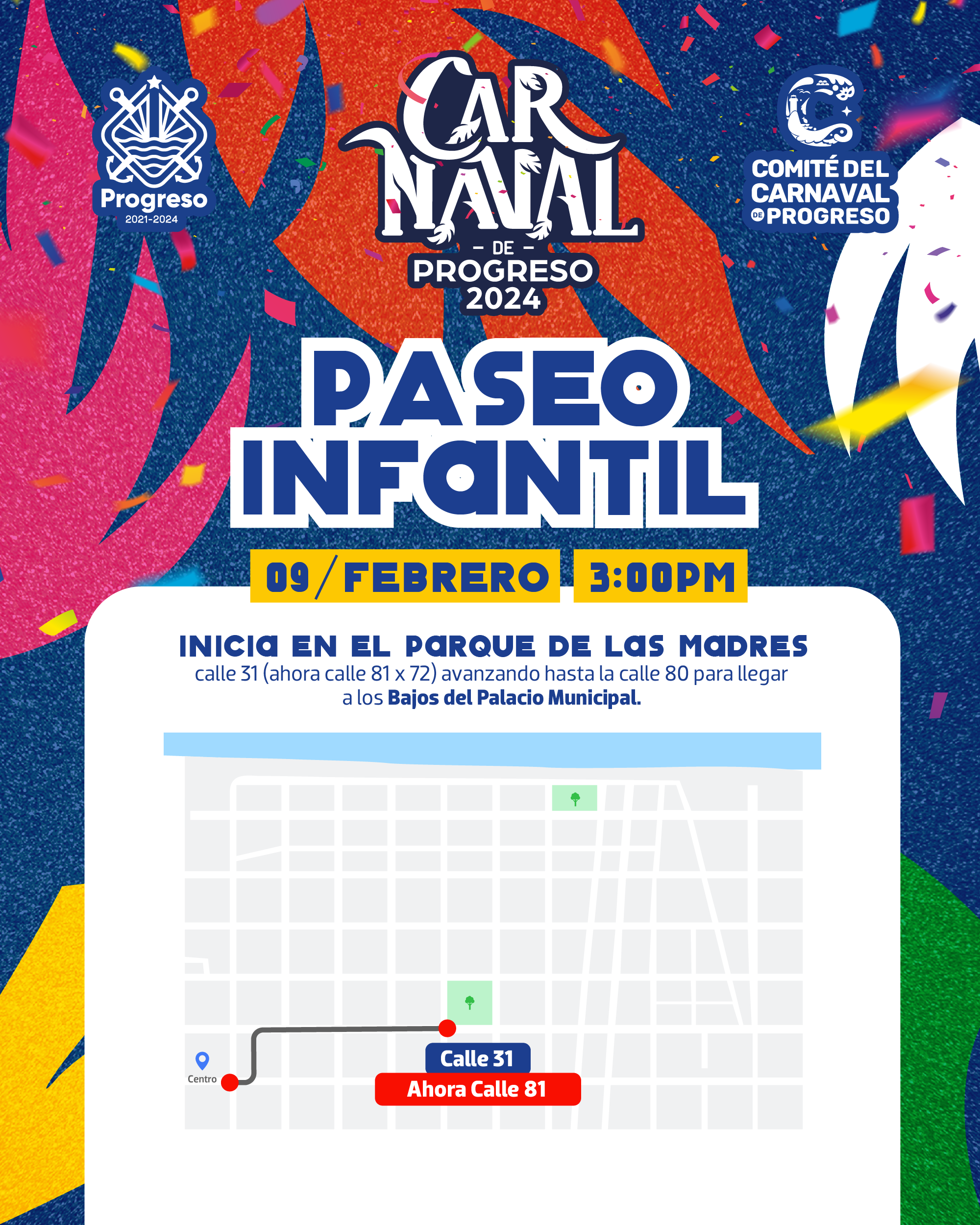 El Desfile Infantil iniciará a las 3 de la tarde en el parque de las Madres, recorrerá la calle 31 rumbo a los bajos del Palacio municipal, por lo que calles aledañas permanecerán cerradas: la 33, ahora calle 83, por 82 hasta la 70, así como la calle 29, ahora 79, por 82 y 70, y la calle 80 por 31, ahora calle 81, y 33, ahora calle 83.