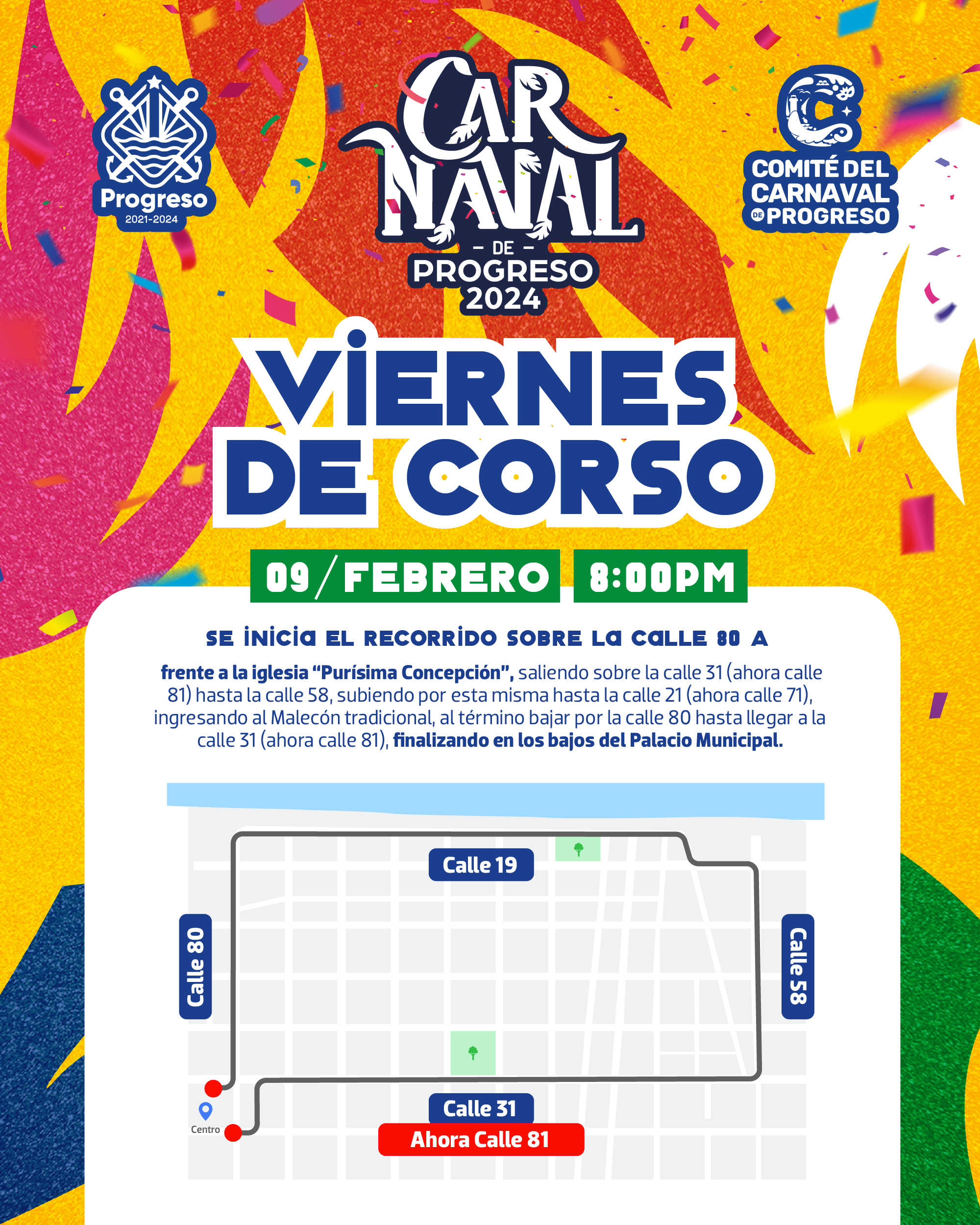 Y por la noche, se llevará a cabo el Paseo de Corso, el cual iniciará en la calle 80 A, frente a la iglesia Purísima Concepción, después recorrer la calle 31, ahora calle 81, hasta la calle 58, para continuar por la calle 21, ahora calle 71, para recorrer lo largo del Malecón tradicional y concluir por la calle 80 hasta los bajos del Palacio Municipal”, explicó la funcionaria municipal.