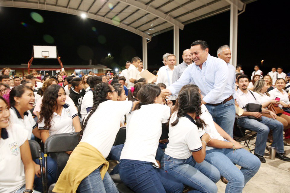A la entrega del techado acudieron también Loreto Villanueva Trujillo, secretaria de Educación; José Luis Martínez Semerena, director de Desarrollo Social y José Collado Soberanis, director de Servicios Públicos Municipales.