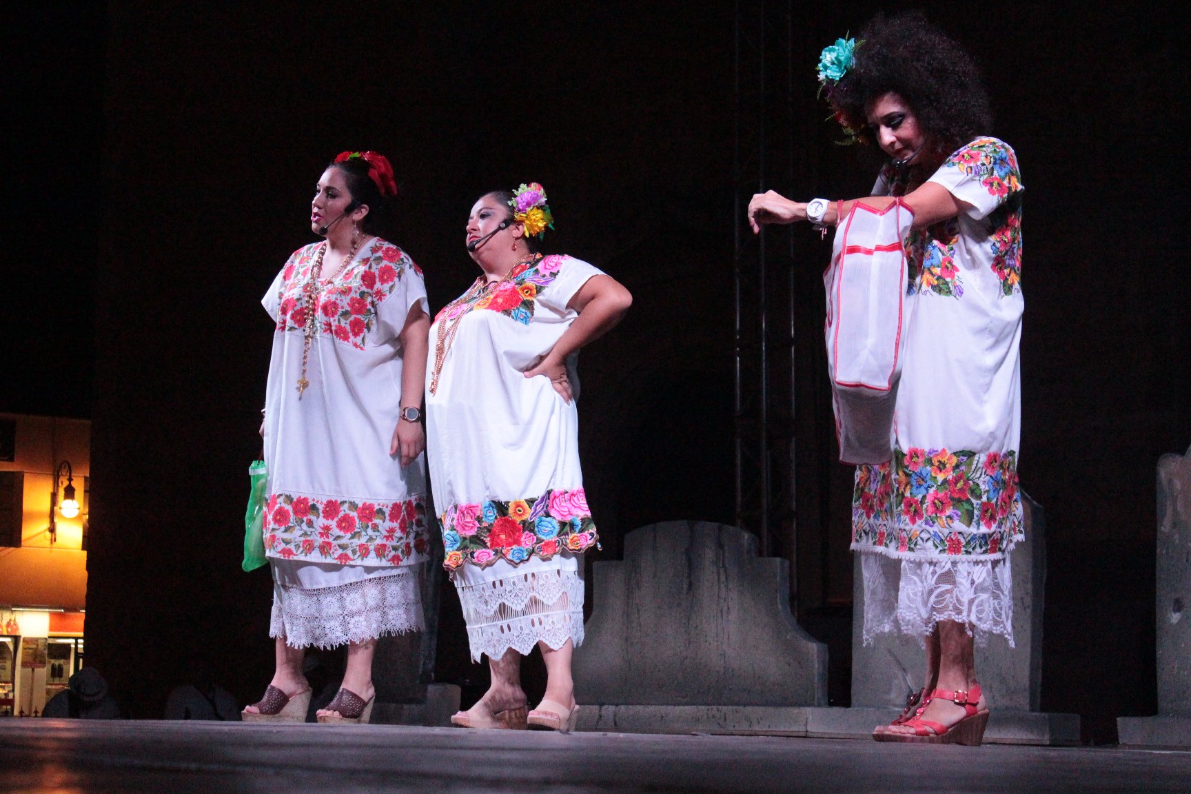 El montaje protagonizado por las calaveras “Catrina” encarnada por Jorge Chablé y “Mestiza” por Madeleine Lizama “Candita” transcurrió entre carcajadas de numeroso público que concentrado en el corazón del Centro Histórico rieron con las ocurrencias de Miguel Coello “Ruperta”, Daniel Herrera “Nohoch”, Fernando Herrera “Cheto”, Narda Acevedo “Chonita”, entre un elenco de más 30 figuras .