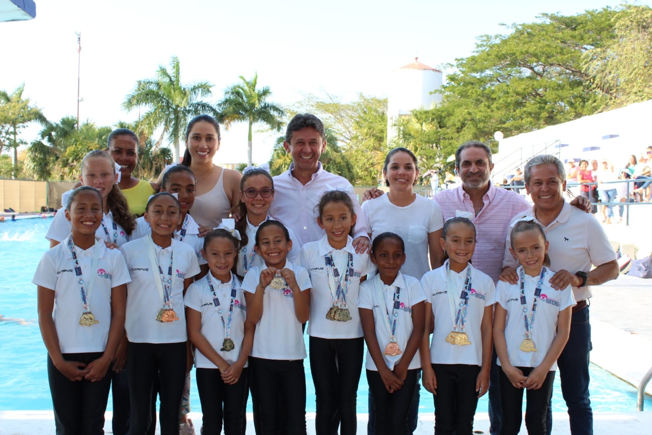 Acompañado de Karem Achach Ramírez, jefa técnica de la especialidad, así como de Astrid Novelo Rosas y Jorge Esteban Abúd, Directora de Alto Rendimiento y Director de vinculación respectivamente, Sáenz Castillo felicitó a las ondinas quienes recientemente participaron con éxito en la Copa Quintana Roo de natación artística, ganando 13 medallas de oro, 3 de plata y 2 de bronce.