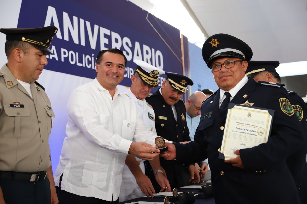Mérida, 18 de junio de 2019. Con un reconocimiento al papel fundamental de la Policía Municipal en la seguridad, tranquilidad y paz social que caracteriza a Mérida, el alcalde Renán Barrera Concha encabezó hoy una ceremonia por el aniversario número 16 de la corporación.