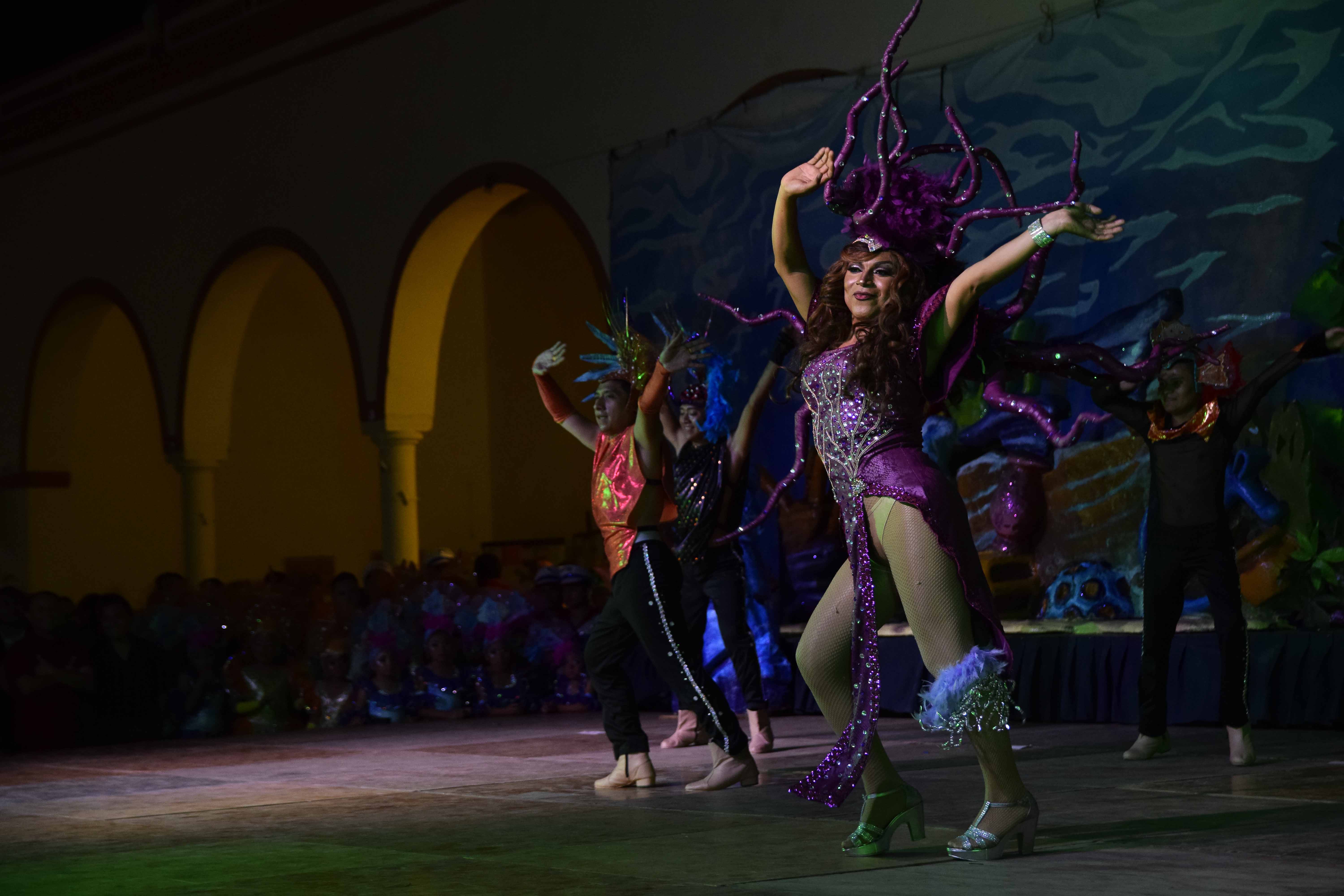 Al término del acto protocolario, los reyes del carnaval junto a sus comparsas presentaron el espectáculo de duración de una hora y 20 minutos en la que marineros, sirenas, tritones, piratas y criaturas marinas se adueñaron del escenario para demostrar sus creativos pasos de bailes y llamativos trajes.