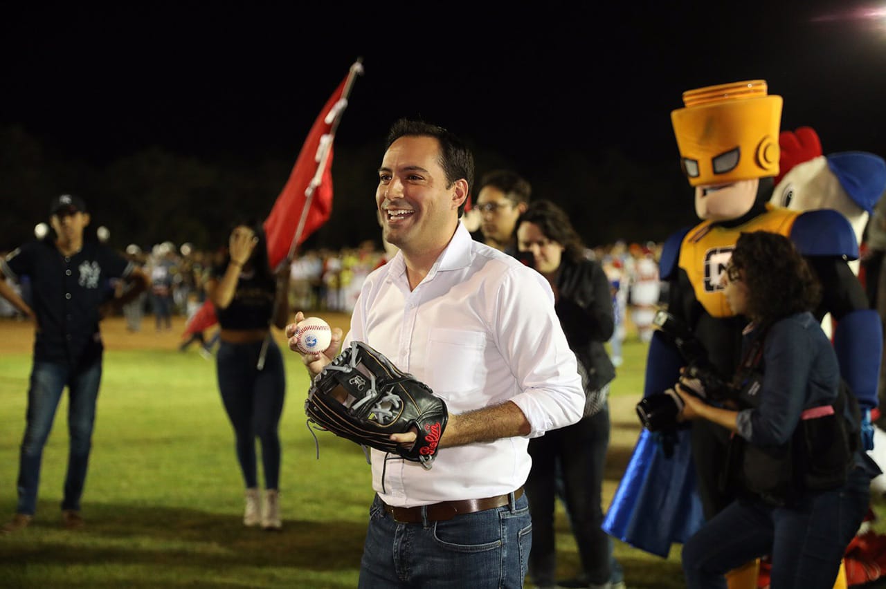 Luego de ver el desfile de los 130 equipos que en sus diferentes categorías participan en este campeonato y hacer la declaratorio inaugural, el Gobernador realizó el lanzamiento de la primera bola en el campo número 1 de esta Liga, una de las de mayor tradición y semillero de peloteros yucatecos profesionales.