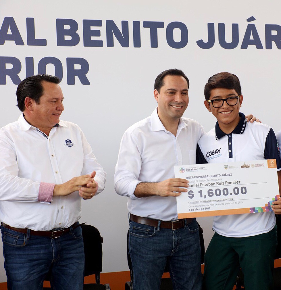 Umán, Yucatán, 3 de abril de 2019 .- Como parte de los esfuerzos conjuntos para disminuir la deserción escolar, el Gobernador Mauricio Vila Dosal puso en marcha la distribución de 53, 493 becas denominadas "Benito Juárez" para jóvenes de nivel bachillerato, que impulsa junto con el presidente Andrés Manuel López Obrador, para respaldar la economía familiar de los estudiantes.