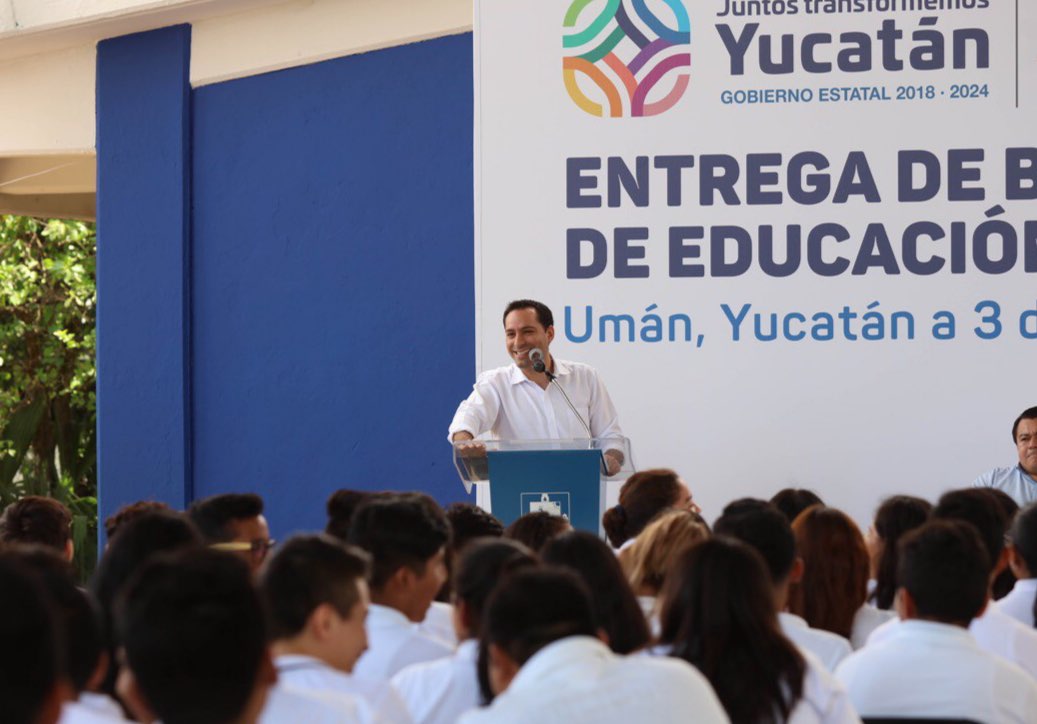 En el plantel Umán del Colegio de Bachilleres del Estado (Cobay), el gobernador encabezó la primera entrega de estos apoyos y reiteró que su administración trabaja de la mano con el Presidente de la República, quien entiende bien las problemáticas del estado.