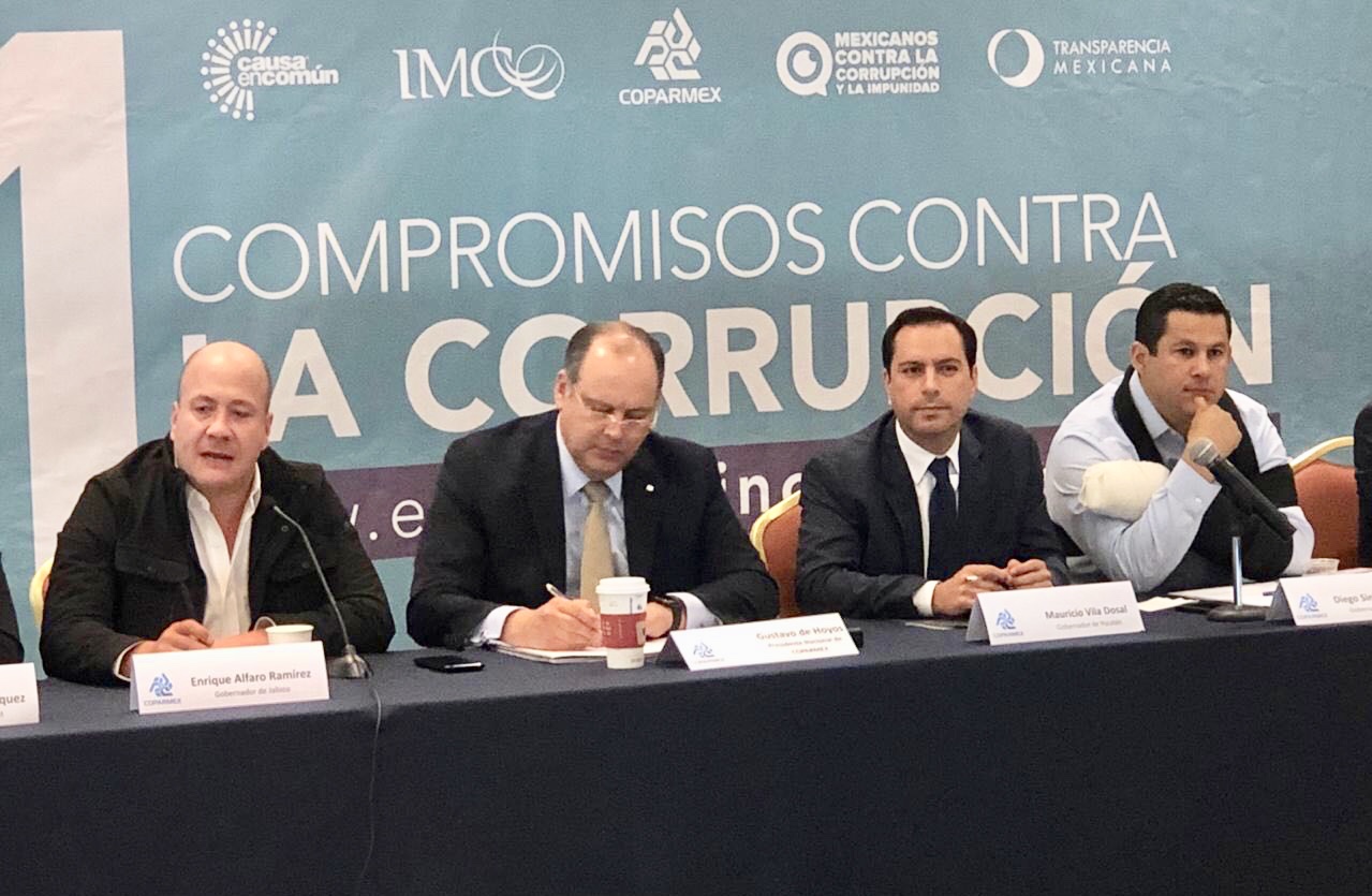 Los “11 Compromisos Contra la Corrupción” fueron firmados por el mandatario el 30 de mayo de 2018 durante su campaña a la gubernatura del estado, con lo que se sumó a esta iniciativa promovida por la Confederación Patronal de la República Mexicana (Coparmex), junto con Transparencia Mexicana, el Instituto Mexicano para la Competitividad (IMCO), Mexicanos Contra la Corrupción y la Impunidad y Causa en Común, que inicio en 2017 y se repitió en el proceso de elecciones locales del año pasado.