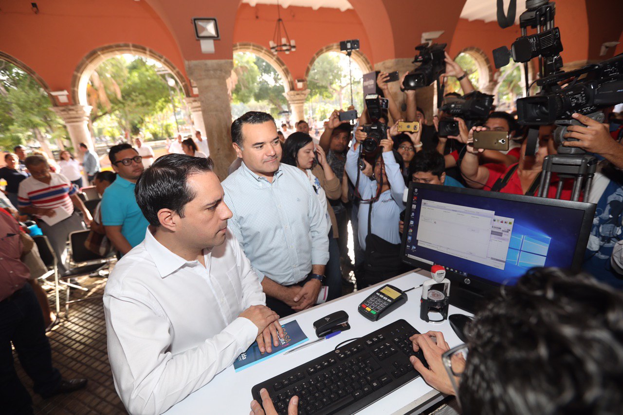 Cerca de las 8:30 de la mañana, el mandatario estatal arribó, acompañado del alcalde de Mérida, Renán Barrera Concha, a la caja recaudadora, ubicada en los bajos del Palacio Municipal, en donde hizo fila para saldar este gravamen en los primeros días del año, así como el costo correspondiente al servicio de recolección de basura.