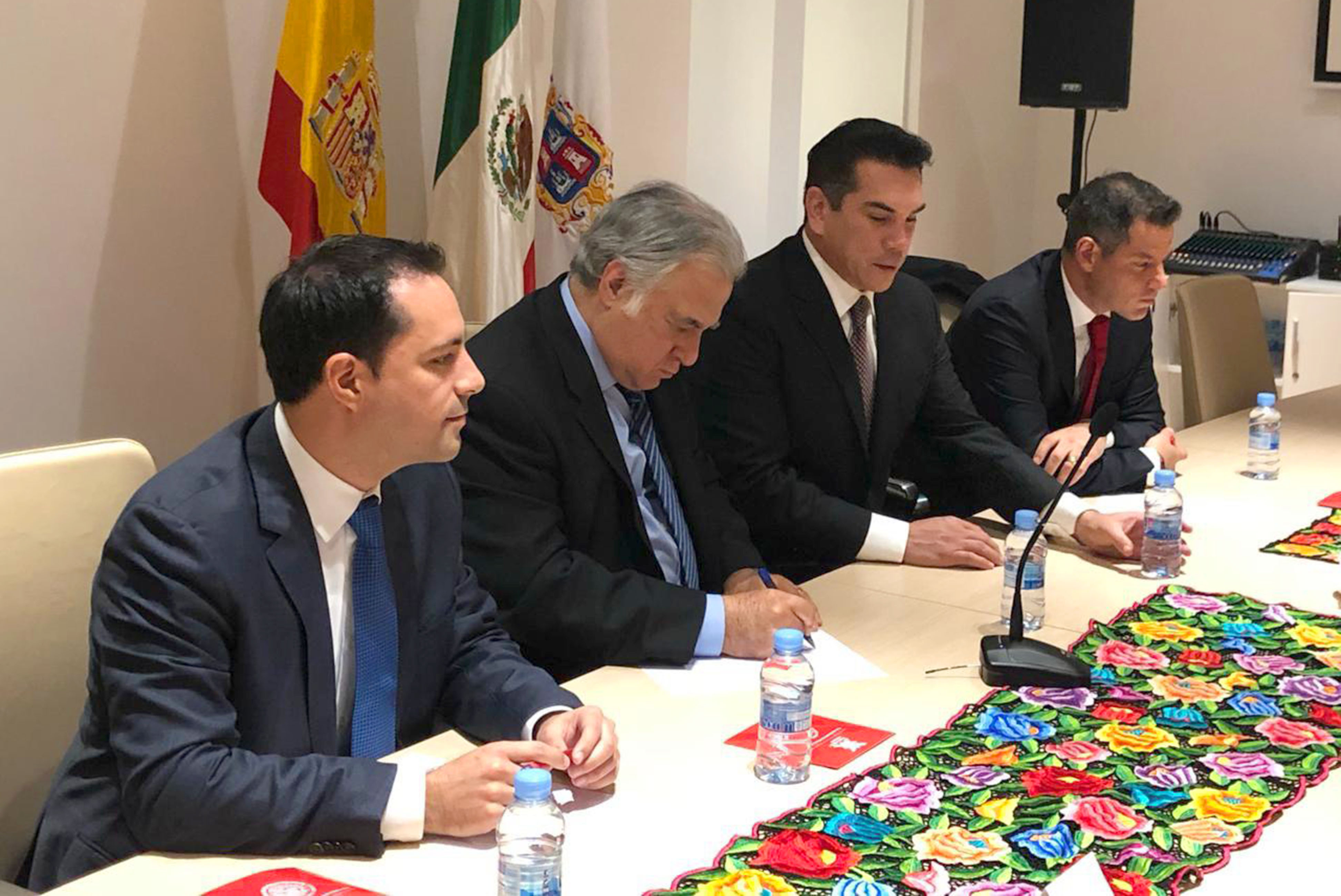 Al iniciar su visita a la capital española previo a participar en la Feria Internacional de Turismo (FITUR) 2019, el mandatario yucateco sostuvo un encuentro con funcionarios de la Sectur, encabezados por Torruco Marqués, y la diplomática mexicana, así como con los Gobernadores de Campeche, Alejandro Moreno Cárdenas y Oaxaca, Alejandro Murat Hinojosa.