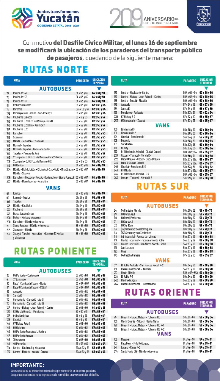 La Oxcum-Tixcacal-Mérida R-1 y R-2, de la 58 entre 69 y 71 por ese día estarán en la 69 entre 66 y 68; Ruta 8 Caucel-Cobay-Ciudad Caucel y Ruta 10 Ciudad Caucel, pasarán de la 62 entre 67 y 69-A a la 66 entre 65 y 67; El Roble R-1, de la 69 entre 54 y 56, a la 69 entre 68 y 70; y Chenkú-Pensiones R-2, de la 56 entre 61 y 63, a la 57 entre 60 y 62.