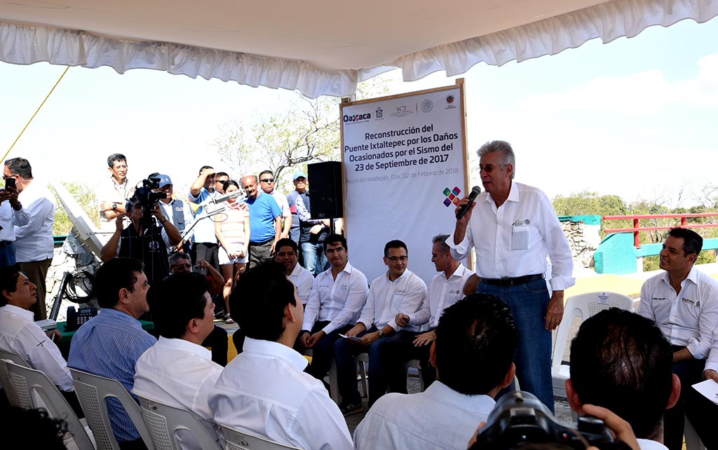 El secretario de Comunicaciones y Transportes, Gerardo Ruiz Esparza, inauguró el Aeropuerto de Ixtepec y los puentes vehiculares de “Ixtaltepec”, “La Ventosa” y “Malayengo II” que fueron destruidos por los sismos del pasado septiembre, en la zona del Istmo de Tehuantepec, Oaxaca, lo que refleja la solidaridad del Gobierno Federal con las comunidades afectadas y se traduce en un beneficio para que la vida vuelva a la normalidad en el estado.