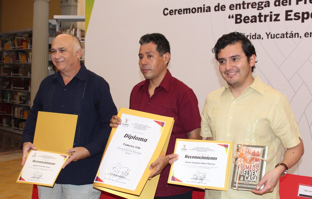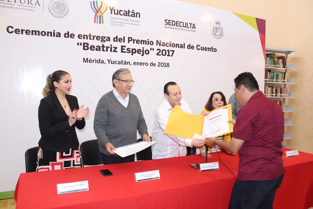 Mérida, Yucatán, 21 de enero de 2018.- El escritor Federico Vite, hidalguense avecindado en Guerrero, recibió esta mañana el Premio Nacional de Cuento “Beatriz Espejo” 2017 en ceremonia encabezada por el titular de la Secretaría de la Cultura y las Artes (Sedeculta), Roger Metri Duarte, con la presencia de la creadora que da nombre al reconocimiento.