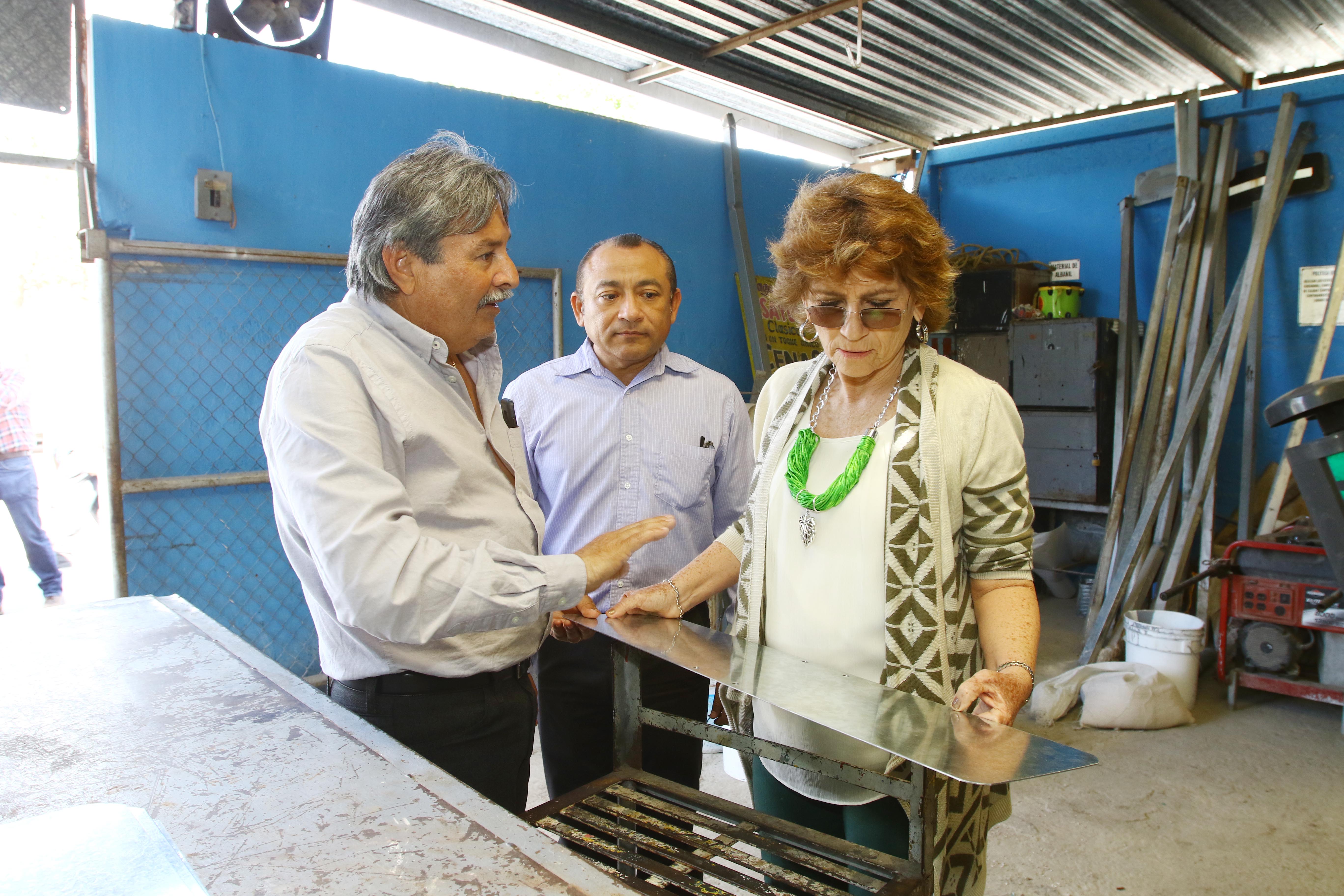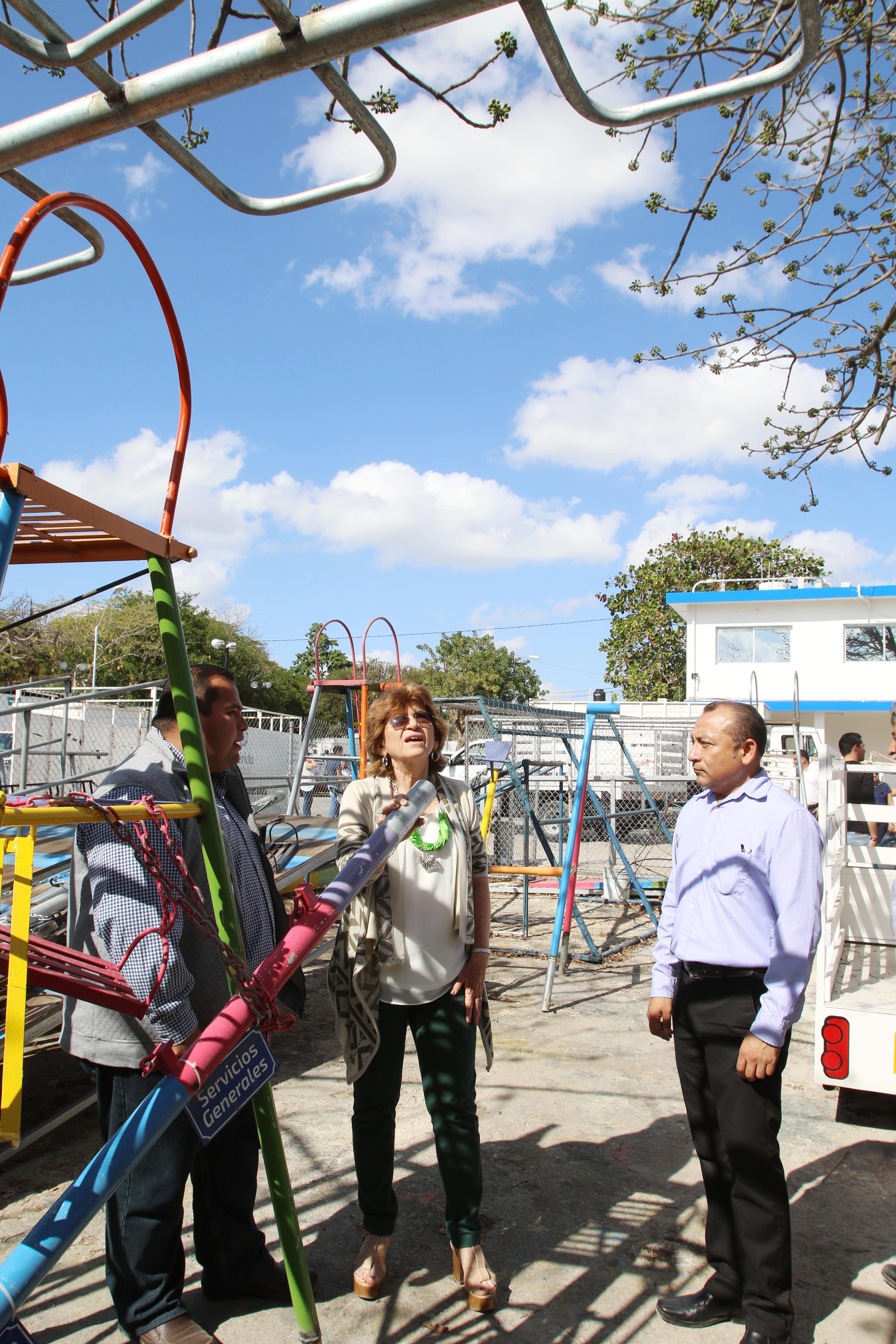 Acompañada del secretario de la Comuna, Arturo Sabido Góngora, y del Coordinador General de Funcionamiento Urbano, César Bojórquez Zapata y Luis Jorge Montalvo Duarte, director de Servicios Públicos Municipales, Fritz Sierra saludó a los trabajadores y recorrió el taller de nomenclatura y el área de mantenimiento de juegos infantiles de los parques meridanos.