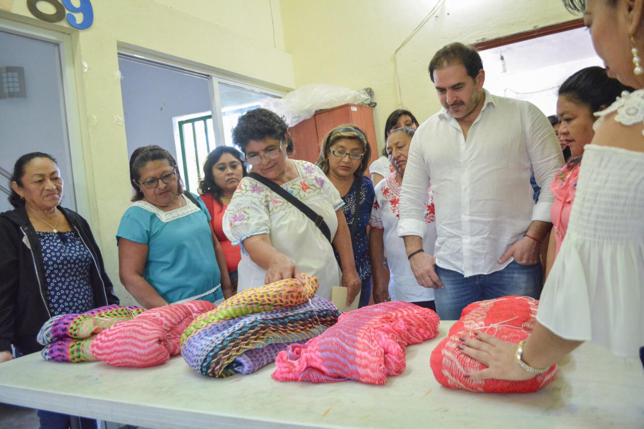 Poco antes de finalizar la entrega, Zacarías Curi recorrió las instalaciones del Hábitat de aquella demarcación, y se tomó el tiempo para escuchar a las mujeres que ahí acuden al taller de urdido, quienes les explicaron las técnicas, los tipos de hilo y el tiempo de elaboración que emplean en sus trabajos.