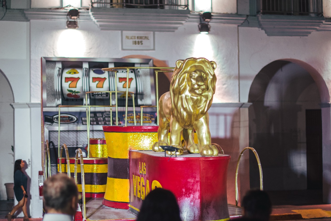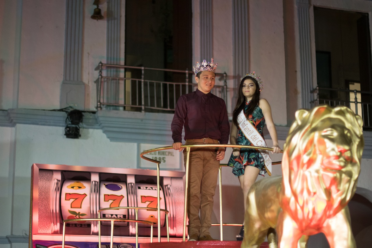 Posteriormente, los Reyes Infantiles, Fabiola Xacur Bates y Carlos Jesús Castro León abordaron “Vegas-Vegas”; carro que refleja la vida nocturna de la Capital del Entretenimiento, con la famosa maquina traga monedas, las fichas y el león.