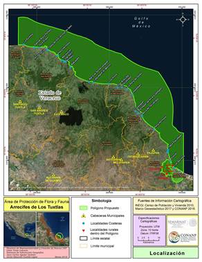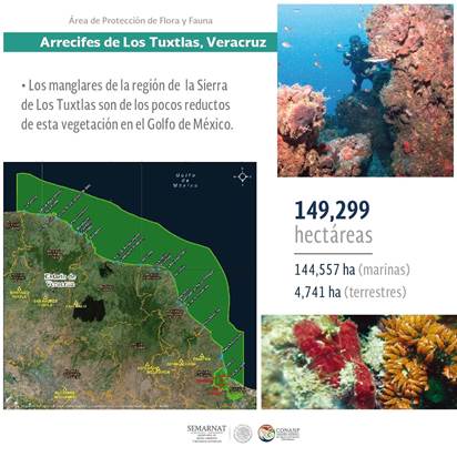 Los Arrecifes de Los Tuxtlas están ubicados en el Estado de Veracruz, cuentan con una superficie total de 149,299 hectáreas: 144,557 ha de superficie marina y 4,741 ha terrestres. Cuando se decrete esta nueva área, se protegerán especies prioritarias de manglares como mangle rojo (Rhizophora mangle), mangle blanco (Laguncularia racemosa), mangle negro (Avicennia germinans) y mangle botoncillo (Conocarpus erectus), incluidos en la NOM-059-SEMARNAT-2010. La presencia de especies protegidas como el coral cuerno de alce (Acropora palmata) y el coral cuerno de venado (Acropora cervicornis) hacen de estos arrecifes un ecosistema de vital importancia para la conservación.