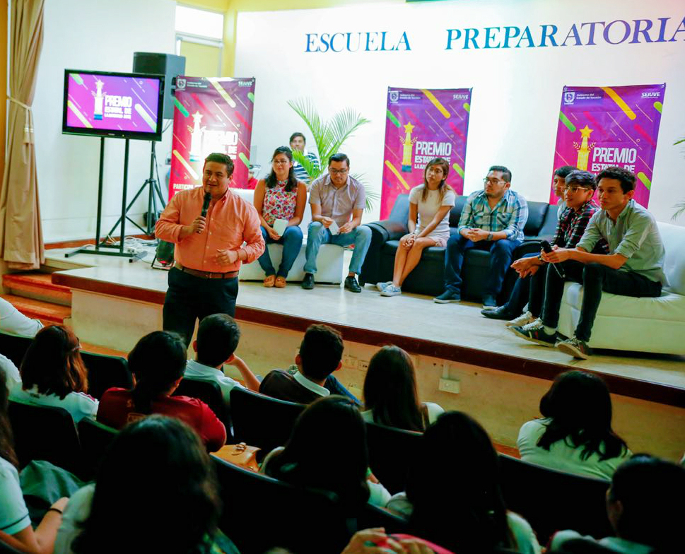 Junto a las y los galardonados de la edición 2017 y el alumnado de la Prepa 2 de la Universidad Autónoma de Yucatán (UADY), el titular de la dependencia, Juan Carlos Barrera Tello, presentó los pormenores de la convocatoria para este año, que abarca del 8 de mayo al 15 de junio.