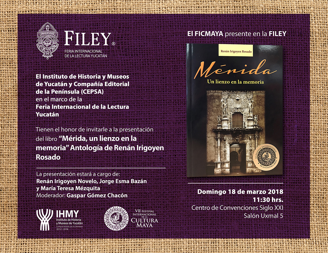 “Mérida, un lienzo en la memoria” tiene por protagonista a esta ciudad capital; en la obra se da cuenta de su historia, su fisonomía, su bautizo, sus rincones, sus lugares icónicos y sus avances en el tiempo, así como la melancolía de sitios que fueron punto de reunión de grandes yucatecos. Este libro será presentado por Renán Irigoyen Novelo, Jorge Esma Bazán y María Teresa Mézquita el domingo 18 de marzo, a las 11:30 hrs., en el Salón Uxmal 5, del Centro de Convenciones Siglo XXI.