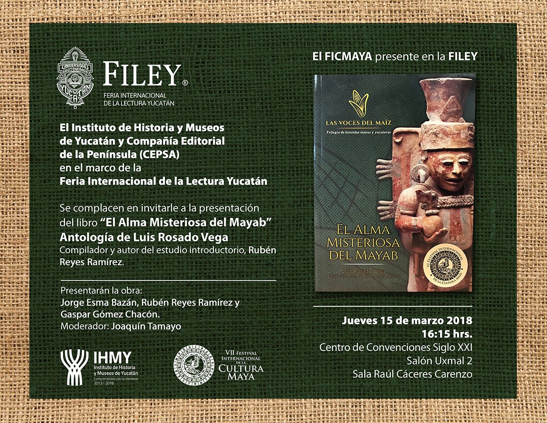“El Alma Misteriosa del Mayab”, compilado por Rubén Reyes Ramírez, quien también escribió el estudio introductorio, será presentado por Jorge Esma Bazán, el propio Rubén Reyes Ramírez y Gaspar Gómez Chacón, teniendo como moderador a Joaquín Tamayo. El evento también será el 15 de marzo, a las 16:15 hrs., en el Centro de Convenciones Siglo XXI, Salón Uxmal 2, Sala Raúl Cáceres Carenzo. Este trabajo redimensiona el acervo de Rosado Vega y lo reintroduce como un verdadero cazador de la cosmogonía maya.