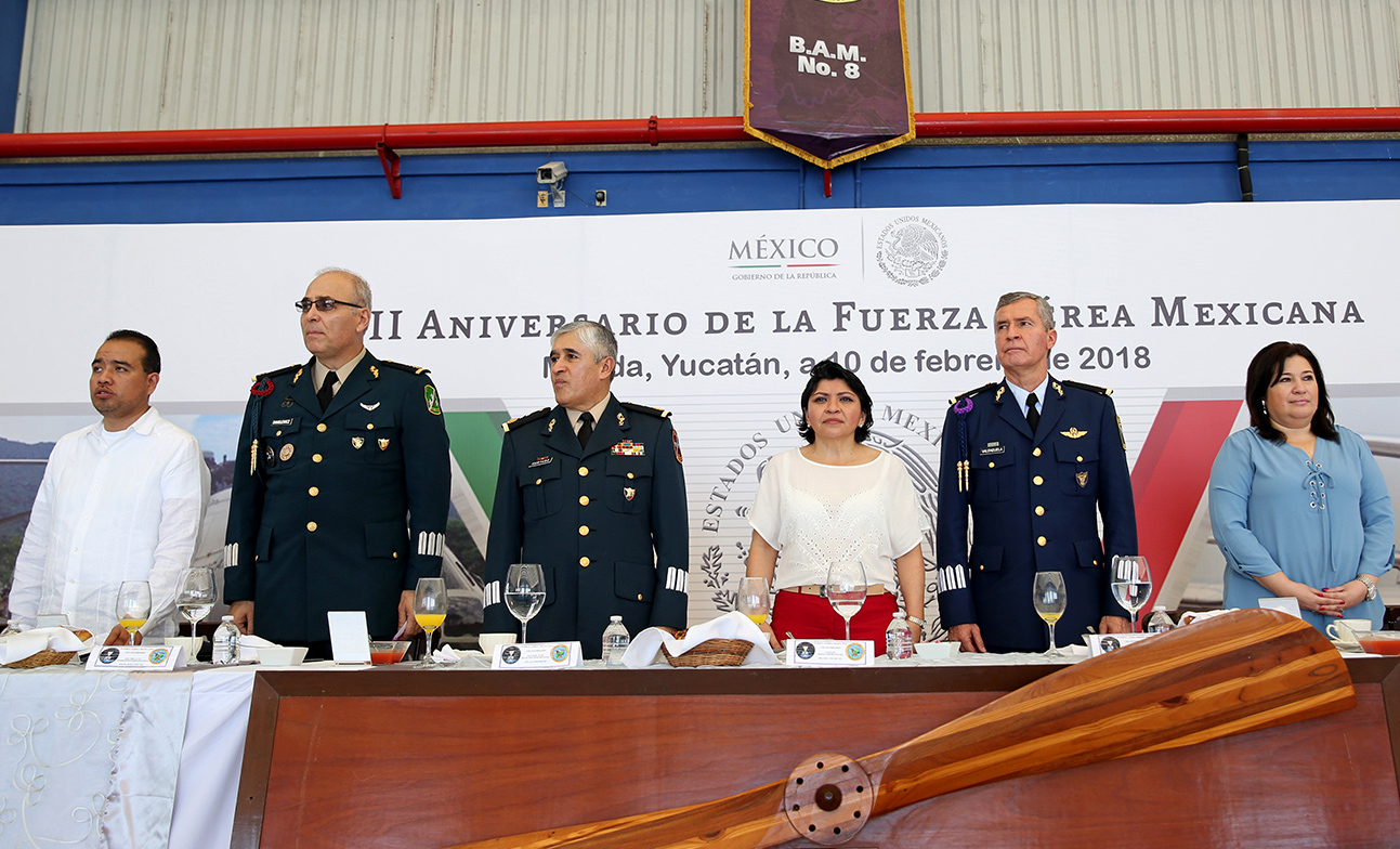 Mérida, Yucatán, 10 de febrero de 2018.- En reconocimiento al orgullo de salvaguardar el espacio nacional con honor y lealtad, y en representación del Gobernador Rolando Zapata Bello, la titular de la Secretaría General de Gobierno (SGG), Martha Góngora Sánchez, asistió a la celebración del CIII aniversario de la Fuerza Aérea Mexicana (FAM).