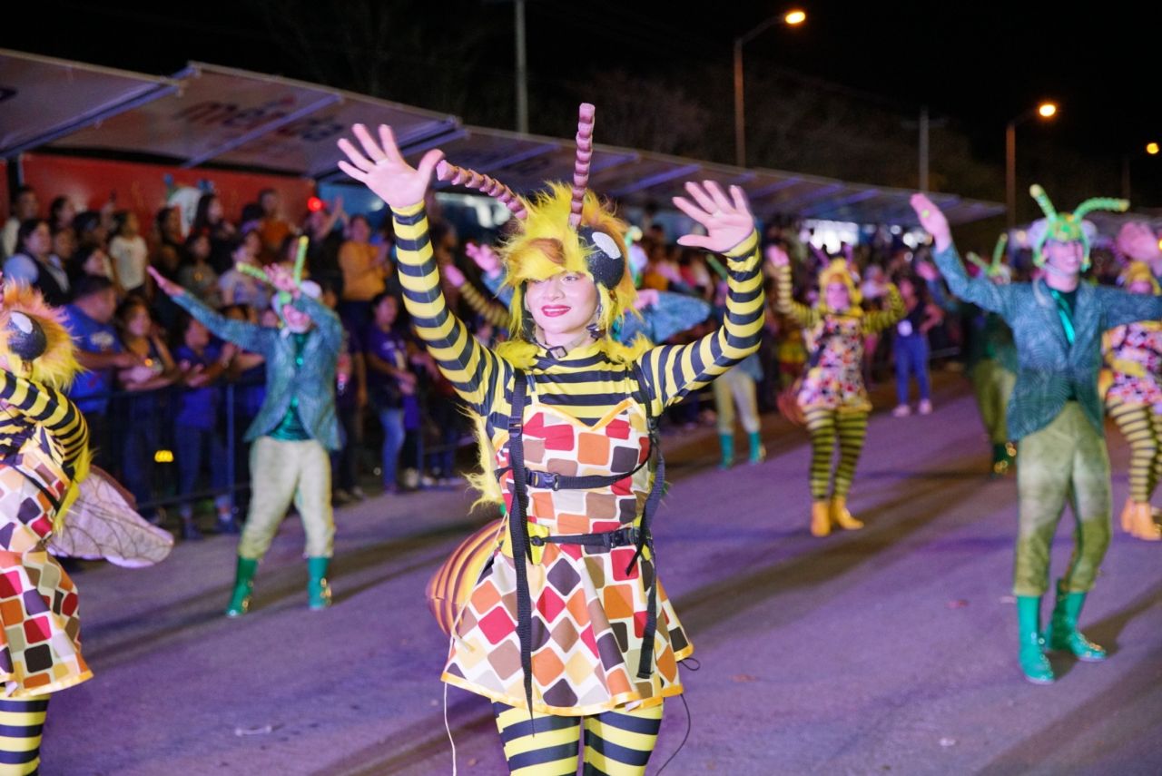 Poco después de las 20:30 horas dio inicio el desfile encabezado por un convoy integrado por grillos y abejas con un despliegue de música y color, ante nutrida asistencia de familias que desde temprana hora llegaron para ocupar buen lugar y ser testigos del comienzo del nuevo carnaval.