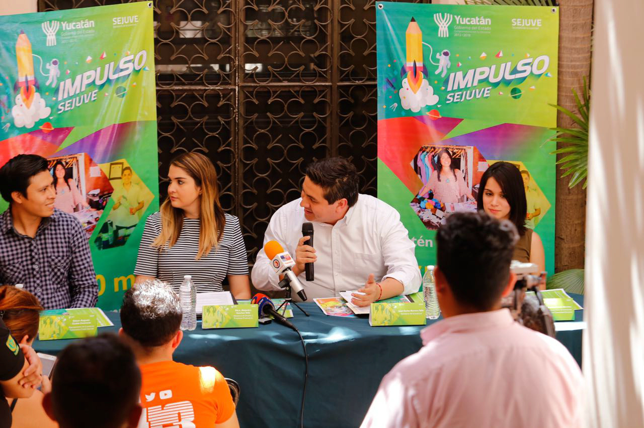 Mérida, Yucatán, 6 de marzo de 2018.- El titular de la Secretaría de la Juventud (Sejuve), Juan Carlos Barrera Tello, lanzó este martes de manera oficial la convocatoria 2018 del esquema auto empleo juvenil, que está a cargo de la dependencia, y a través del cual las y los emprendedores pueden recibir hasta 75 mil pesos para iniciar un negocio.