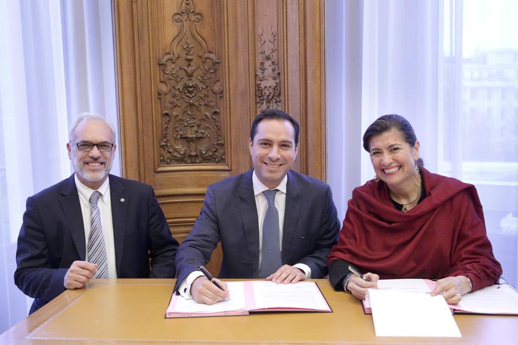 París, Francia, 25 de enero de 2019.- Para ofrecer a los yucatecos trámites y servicios administrativos más simples, rápidos y eficientes, el Gobernador Mauricio Vila Dosal y la directora general de la Organización para la Cooperación y el Desarrollo Económicos (OCDE), Gabriela Ramos, firmaron en París, Francia, un convenio de colaboración, mediante el cual se aplicarán acciones que permitan agilizar la gestión de los procesos de la administración pública estatal.
