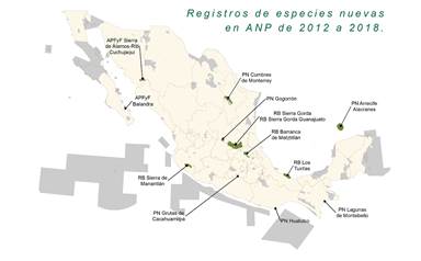 Estas nuevas especies incluyen 10 invertebrados, 1 pez, 2 anfibios, 6 especies de plantas, 1 bacteria y 1 hongo, las cuales fueron localizadas en las ANP: Reserva de la Biosfera (RB) Sierra de Manantlán; Parque Nacional (PN) Huatulco; Área de Protección de Flora y Fauna (APFF) Balandra; RB Los Tuxtlas; PN Grutas de Cacahuamilpa; PN Arrecife Alacranes; RB Sierra Gorda de Guanajuato; PN Gogorrón; PN Lagunas de Montebello; APFF Sierra de Alamos-Río Cuchujaqui; RB Barranca de Metztitlán; PN Cumbres de Monterrey y RB Sierra Gorda, Querétaro.