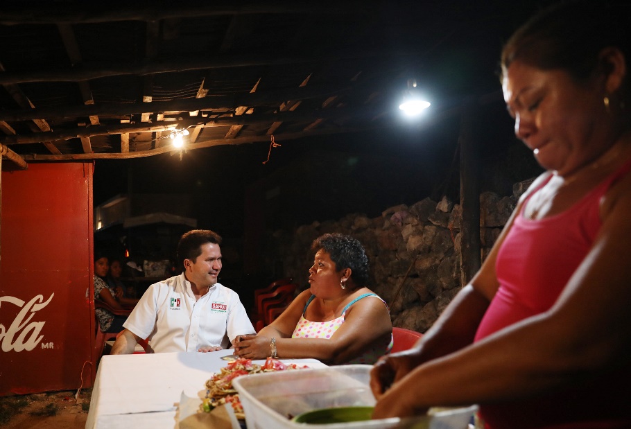 En un momento de su visita al municipio de Peto, el candidato del PRI, PVEM y Panal a la gubernatura, Mauricio Sahuí, tuvo la oportunidad de platicar con doña Mary y compartirle su propuesta “Mejores policías, más seguridad”.