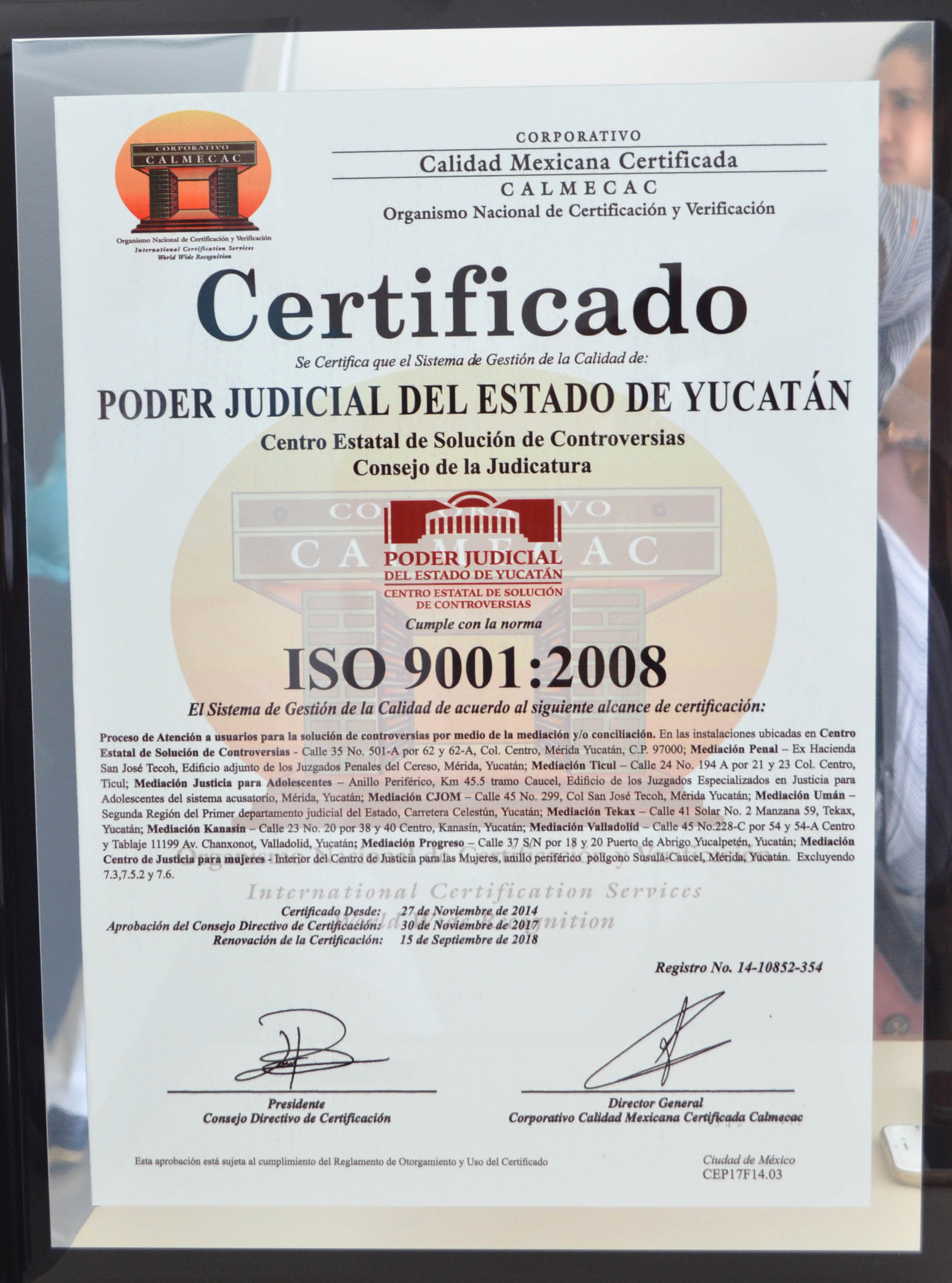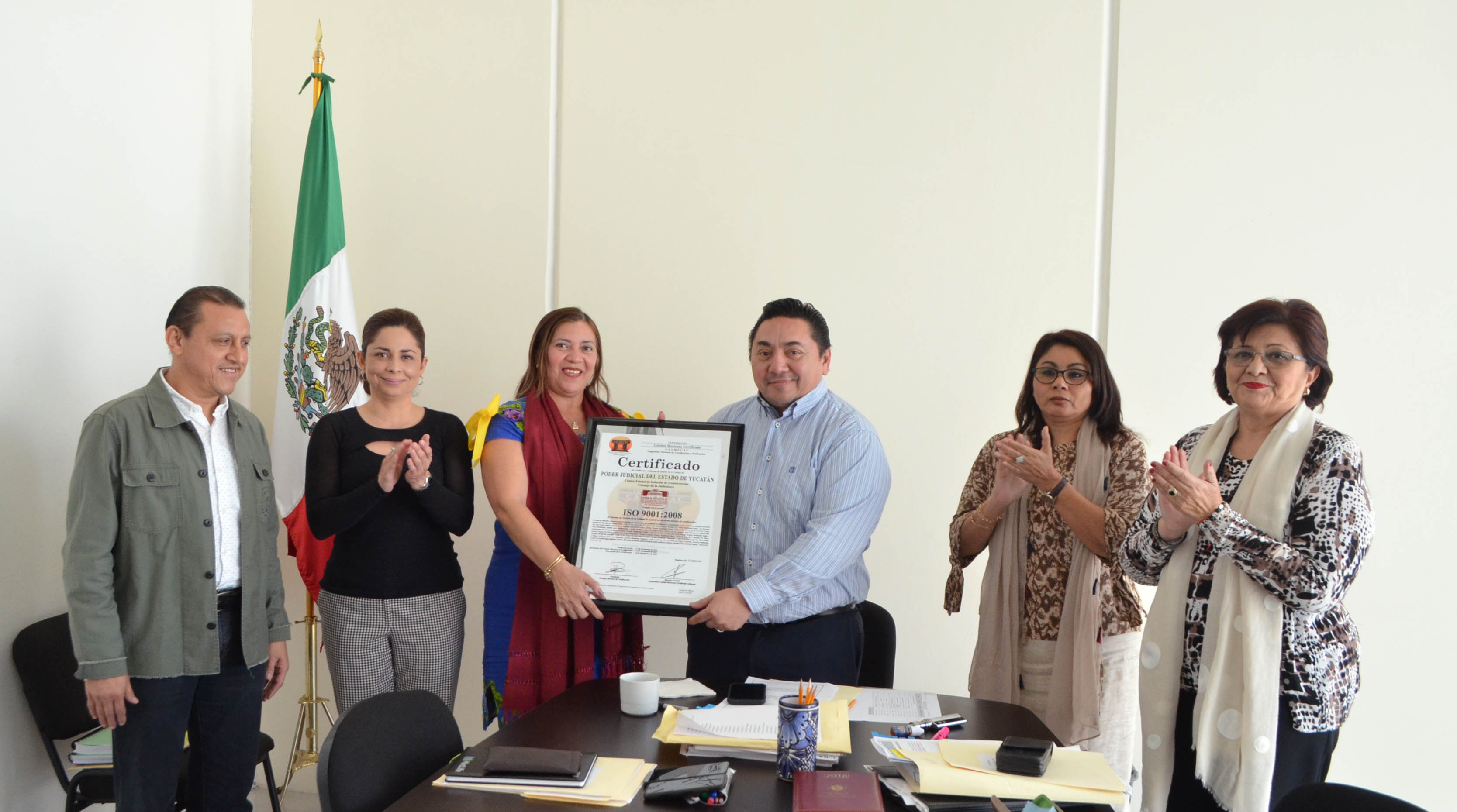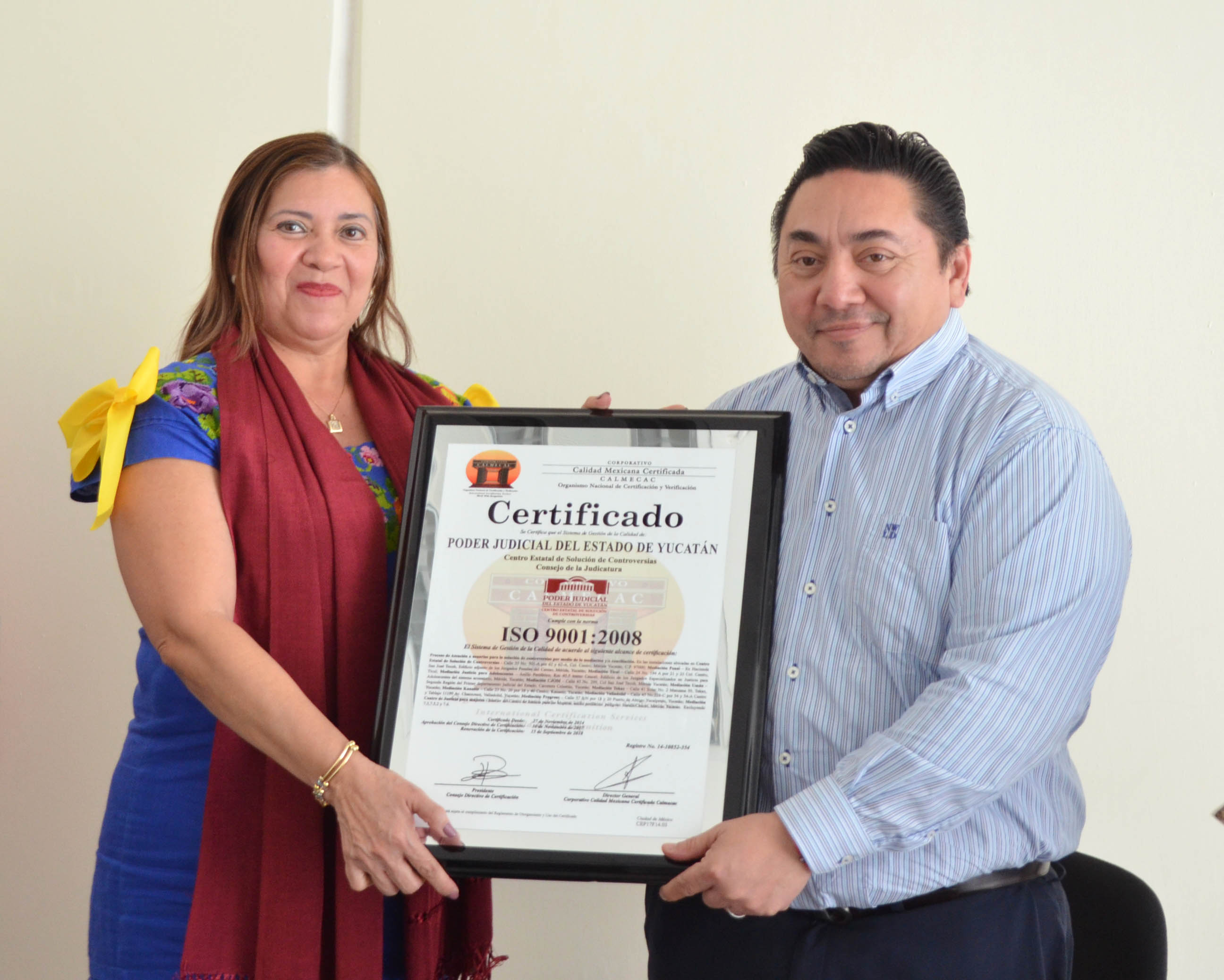El Poder Judicial del Estado de Yucatan recibió esta mañana el documento certifica el sistema de gestión de calidad del Centro Estatal de Solución de Controversias (o Centro de Mediación) al cumplir con los estándares normativos establecidos en la norma ISO-9001:2008, la cual obtuvo originalmente desde el año 2014.