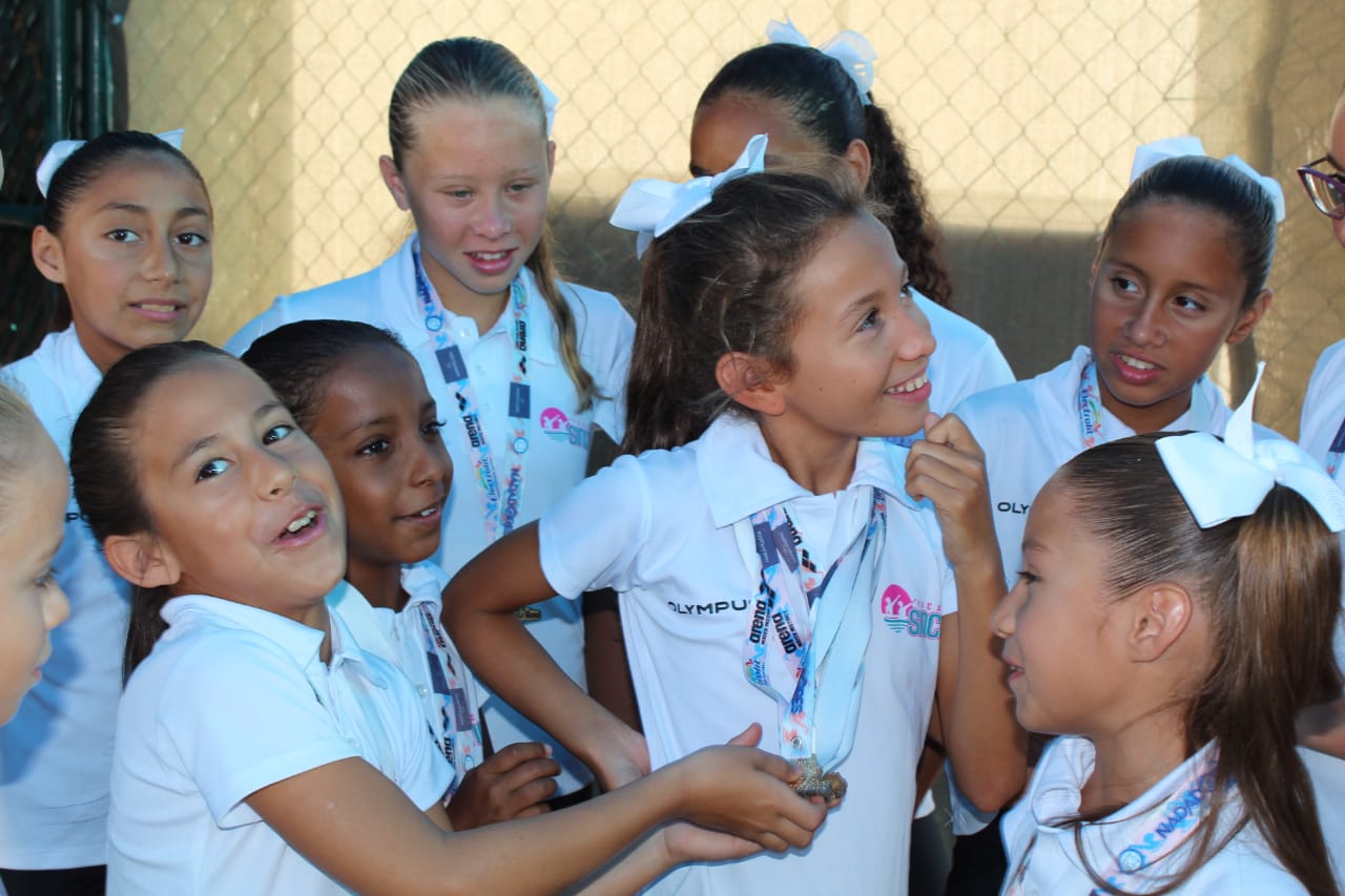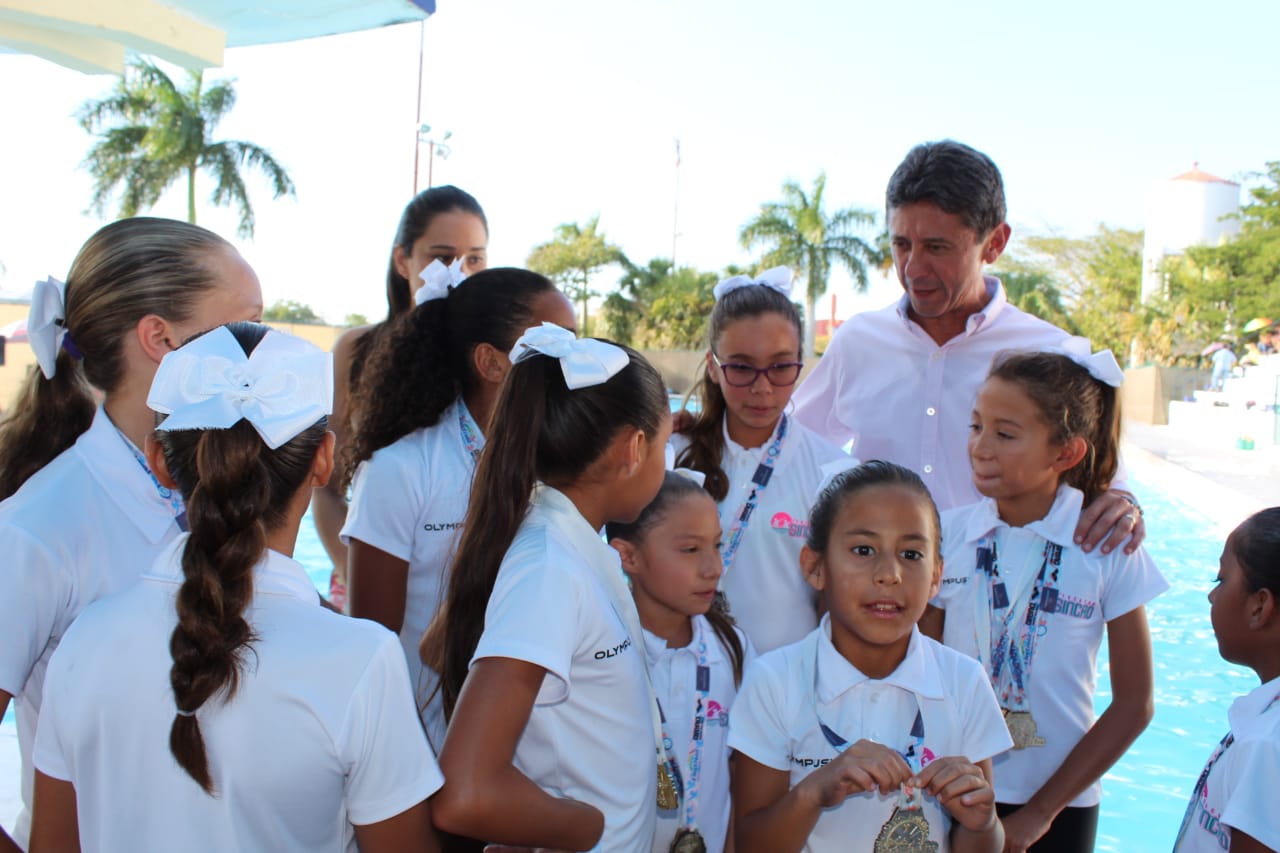 Acompañado de Karem Achach Ramírez, jefa técnica de la especialidad, así como de Astrid Novelo Rosas y Jorge Esteban Abúd, Directora de Alto Rendimiento y Director de vinculación respectivamente, Sáenz Castillo felicitó a las ondinas quienes recientemente participaron con éxito en la Copa Quintana Roo de natación artística, ganando 13 medallas de oro, 3 de plata y 2 de bronce.
