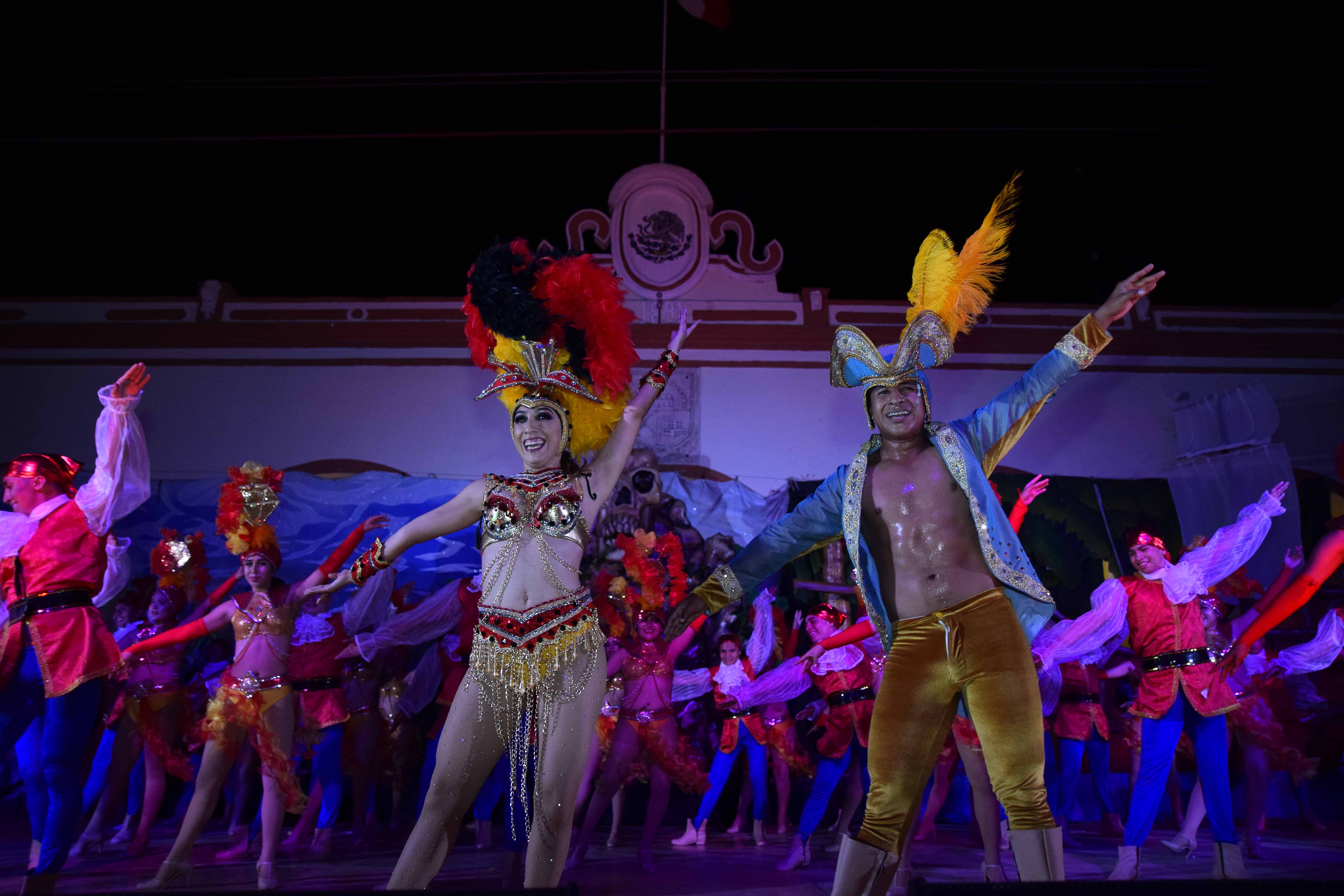 Al término del acto protocolario, los reyes del carnaval junto a sus comparsas presentaron el espectáculo de duración de una hora y 20 minutos en la que marineros, sirenas, tritones, piratas y criaturas marinas se adueñaron del escenario para demostrar sus creativos pasos de bailes y llamativos trajes.