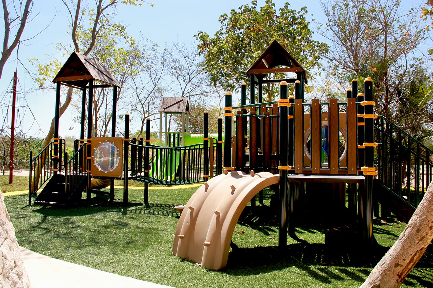 Se construyó además un área infantil que cuenta con 6 juegos infantiles, piso de concreto, pavimento de caucho reciclado, pasto sintético, pasto tipo americano en rollo, cerca perimetral con la intención de que hay control con los niños que van a estar en esa área, además de cuenta con un 3 accesos para tener un mayor control de los infantes que estarán en esa zona, además de un portón metálico.