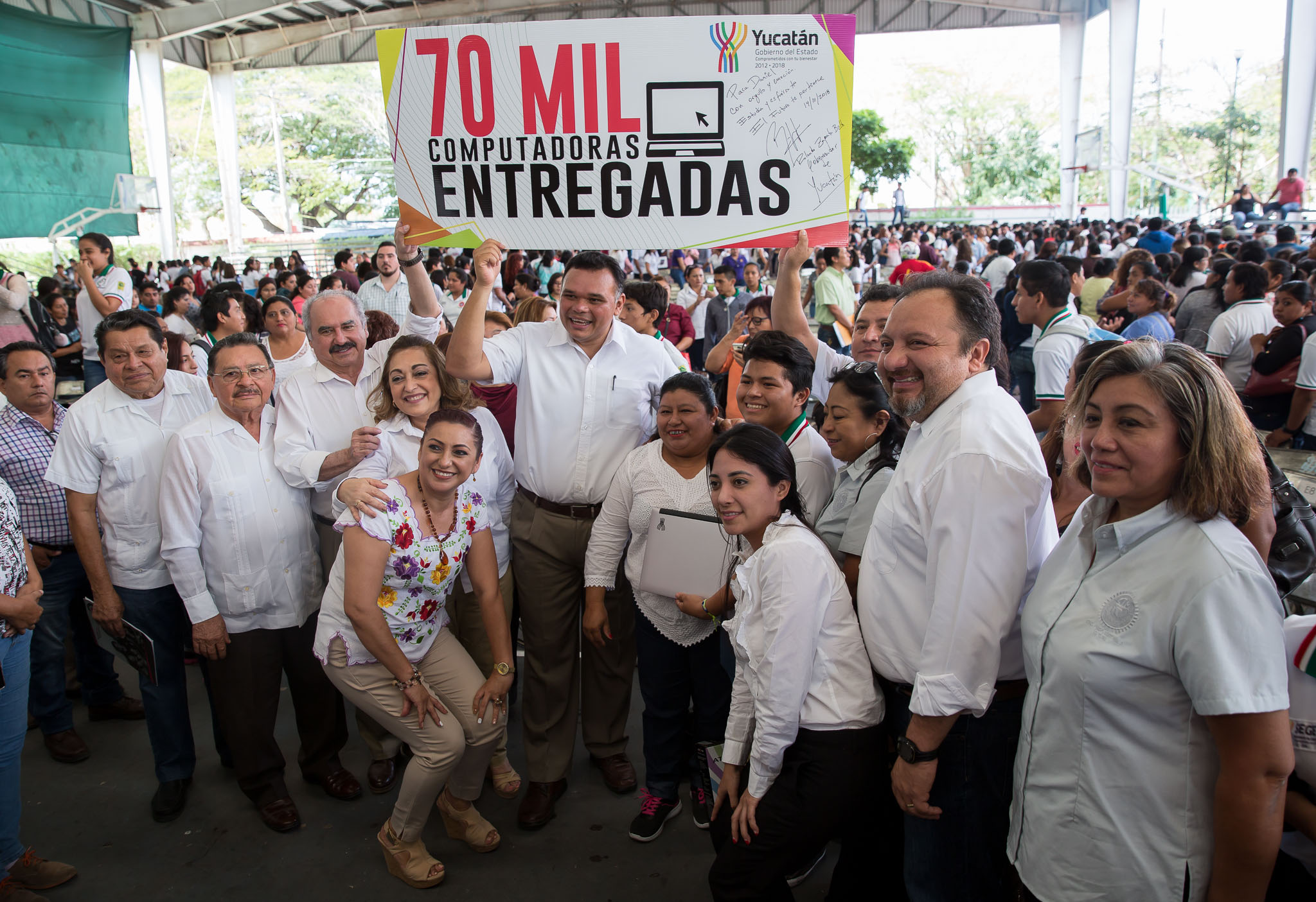 El Gobernador Rolando Zapata Bello entregó este día al joven y a dos mil 236 estudiantes de bachillerato sus laptops de dicho esquema, con lo que el número de personas favorecidas alcanzó la cifra de 70 mil 544, lo cual rebasa la meta inicial de 50 mil, establecida en el compromiso 80.