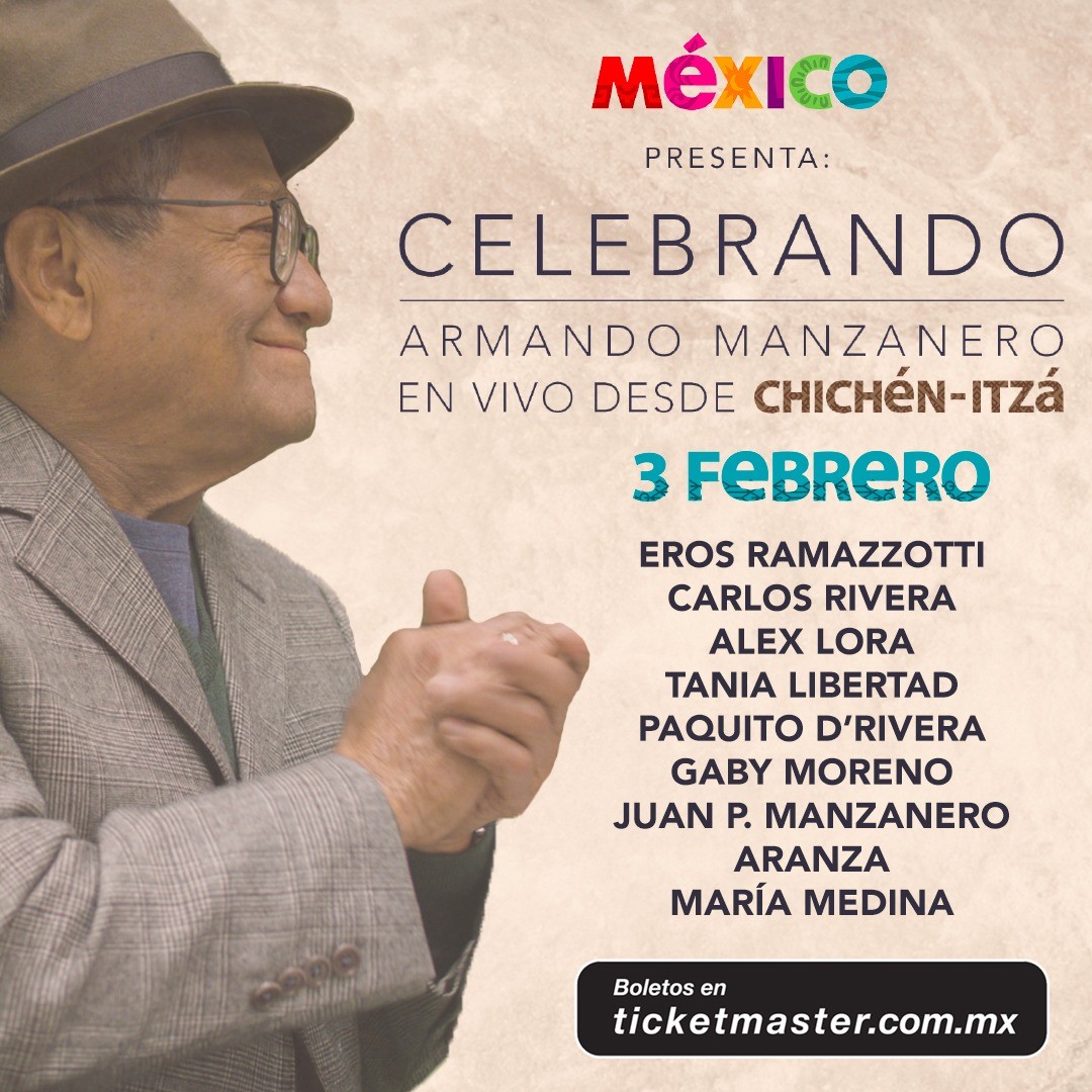 Manuel Reta, organizador del evento “Celebrando Armando Manzanero en vivo desde Chichen Itzá” el cual se realizará en una de las 7 maravillas modernas del mundo el próximo 3 de febrero, dio a conocer por medio de un comunicado que al elenco anterior anunciado hace unos días en rueda de prensa, se suman el italiano Eros Ramazzotti y Carlos Rivera.