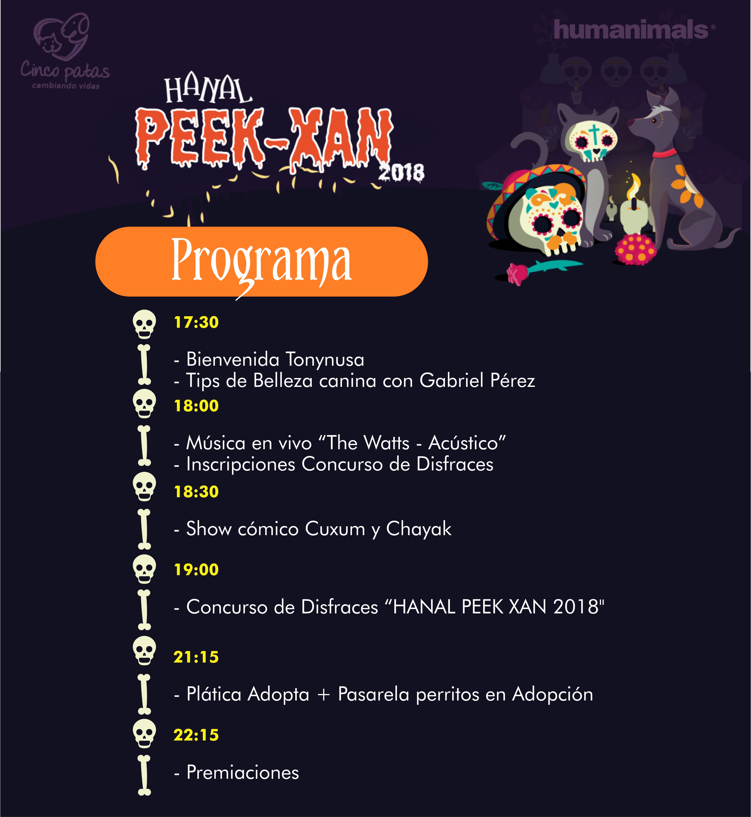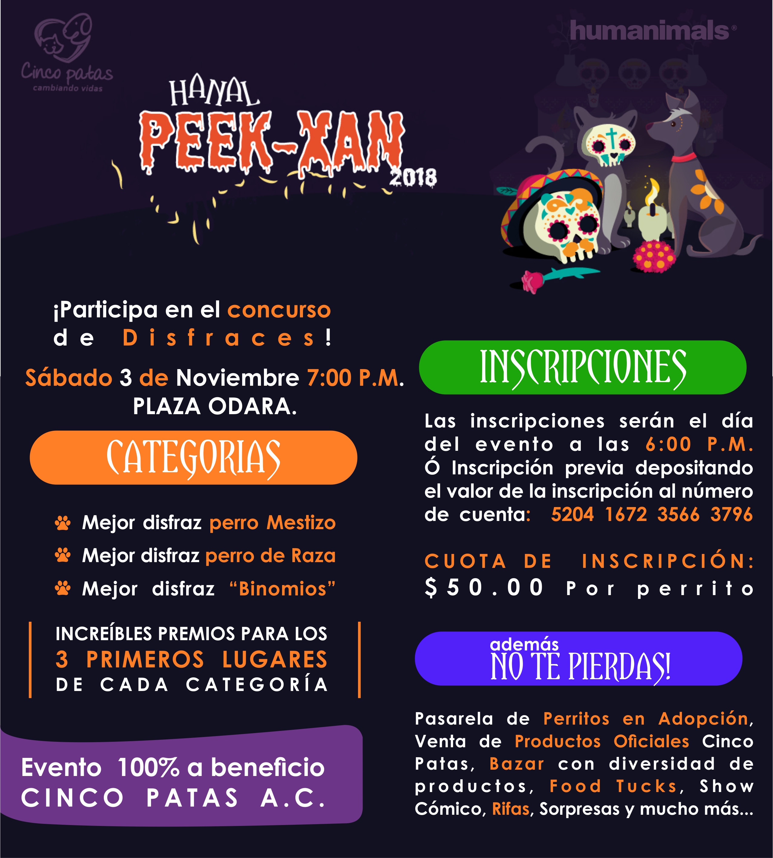 Con el objetivo de recaudar fondos para la asociación Cinco Patas A.C. y poder seguir ayudando a perros y gatos, apoyados por distintos patrocinadores, realizaran por sexto año consecutivo el HANAL PEEK XAN, el próximo sábado 3 de noviembre en Plaza Odara (Avenida Yucatán). En este año se unieron con la empresa Humanimal’s para realizar el evento y celebrar de igual manera la inauguración de la nueva sucursal de esta empresa.