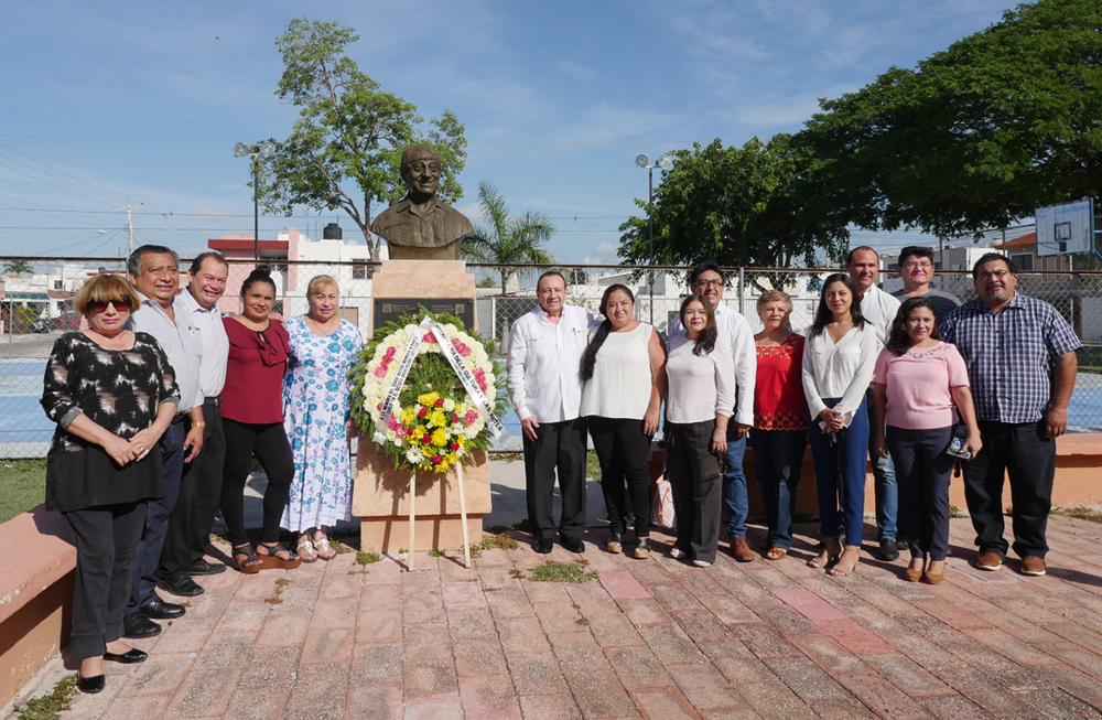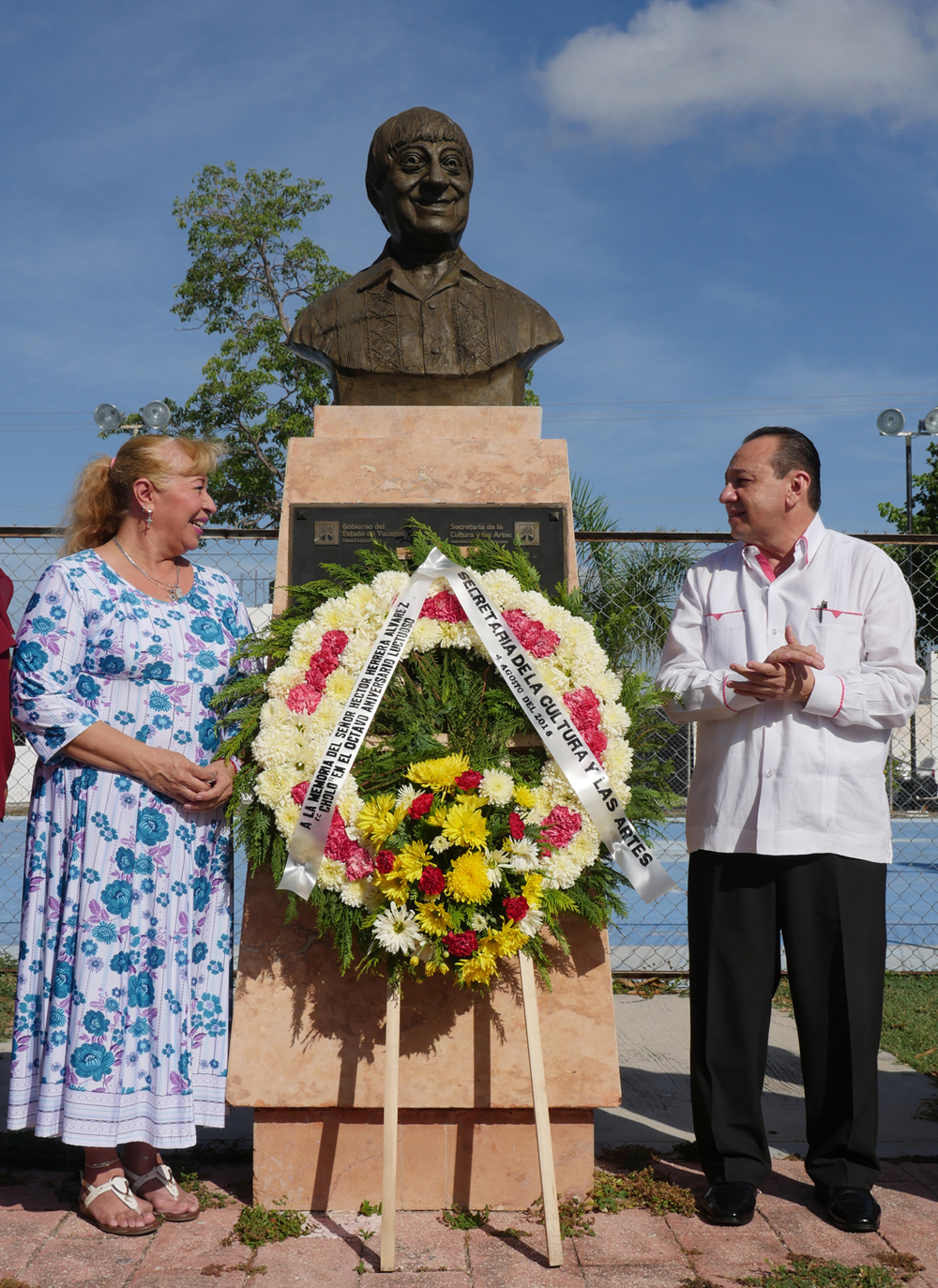 El titular de la Secretaría de la Cultura y las Artes (Sedeculta), Roger Metri Duarte, acompañado por Jazmín López Novelo, identificada también como “Tina Tuyub” y viuda del homenajeado, depositó una ofrenda floral ante el busto del extinto comediante, ubicado en el parque del Teatro Regional del fraccionamiento Pensiones.