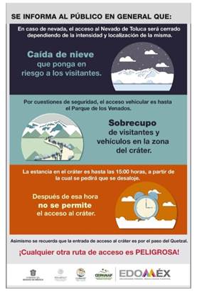 Por lo anterior y con el objetivo de prevenir accidentes a los visitantes, la Comisión Nacional de Áreas Naturales Protegidas (CONANP), en coordinación con el Grupo Técnico de Contingencias del APFF Nevado de Toluca, informan que da inicio el “Operativo de Temporada Invernal” el cual consiste en cerrar el acceso vehicular, a partir de donde inicia la terracería que conduce al “Parque de los Venados”, ubicándose el bloqueo a aproximadamente a 400 metros de la Localidad de “Raíces”, municipio de Zinacantepec, Estado de México.