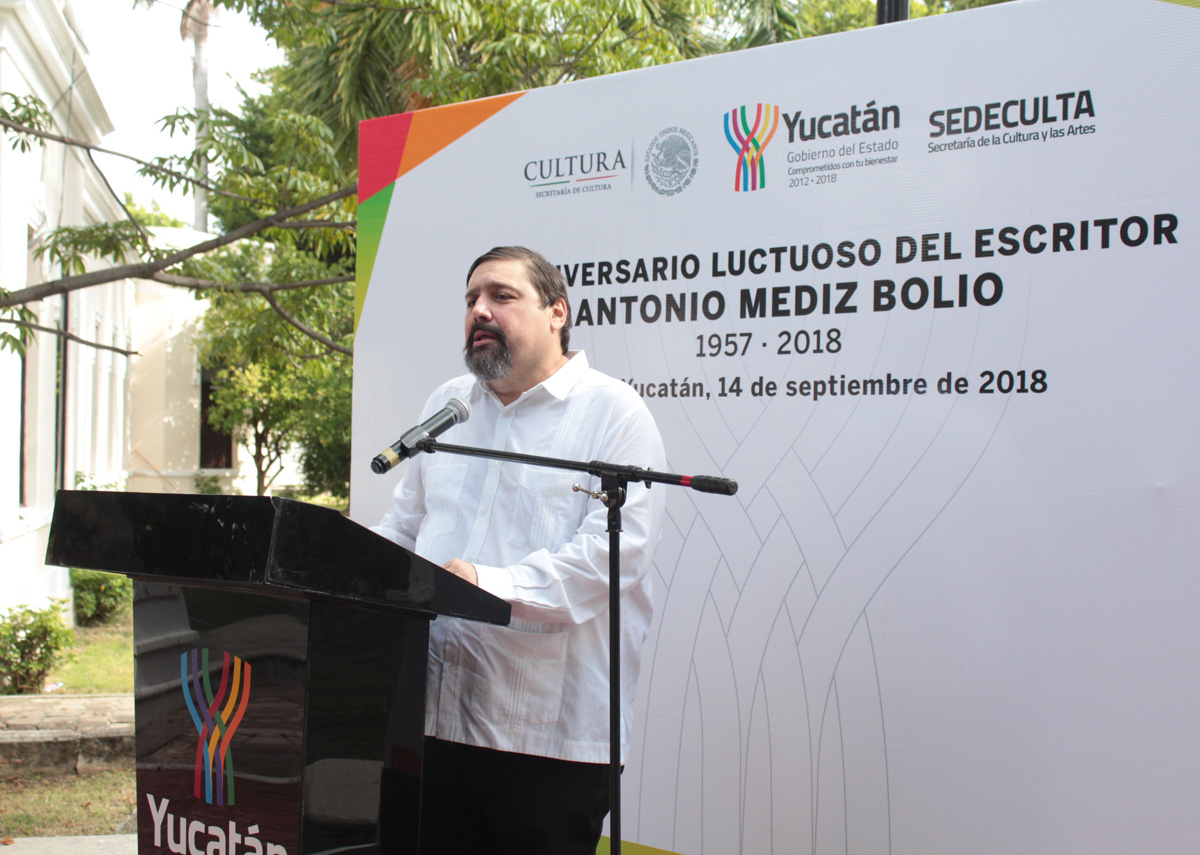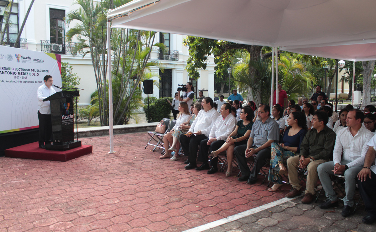 Mérida, Yucatán, 14 de septiembre de 2018.- Reconocer que, mediante su obra, promovió la política indigenista y concibió una identidad yucateca, fue el mensaje que las autoridades emitieron en la ceremonia conmemorativa del LXI aniversario luctuoso del escritor Antonio Mediz Bolio.