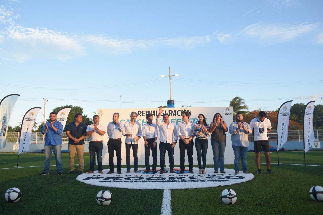 Progreso, Yucatán a 06 de junio 2019.- “Hoy se logra algo histórico, una rehabilitación nunca antes vista en más de 50 años, hay que aplaudirlo, es un trabajo muy fuerte después de un tiempo en el que Progreso carecía de atención, hoy un gran equipo de trabajo pone su mayor esfuerzo en hacer las cosas bien”, dijo el Alcalde Julián Zacarías Curi, en la reinauguración de las instalaciones del Campo deportivo Benito Juárez de “La Federal”.