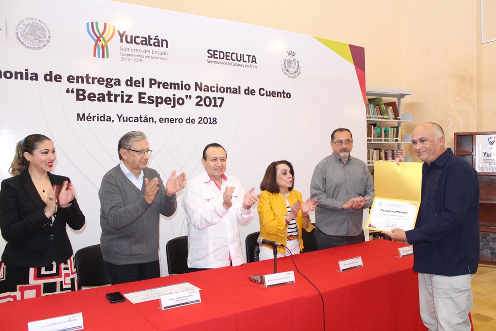 Mérida, Yucatán, 21 de enero de 2018.- El escritor Federico Vite, hidalguense avecindado en Guerrero, recibió esta mañana el Premio Nacional de Cuento “Beatriz Espejo” 2017 en ceremonia encabezada por el titular de la Secretaría de la Cultura y las Artes (Sedeculta), Roger Metri Duarte, con la presencia de la creadora que da nombre al reconocimiento.