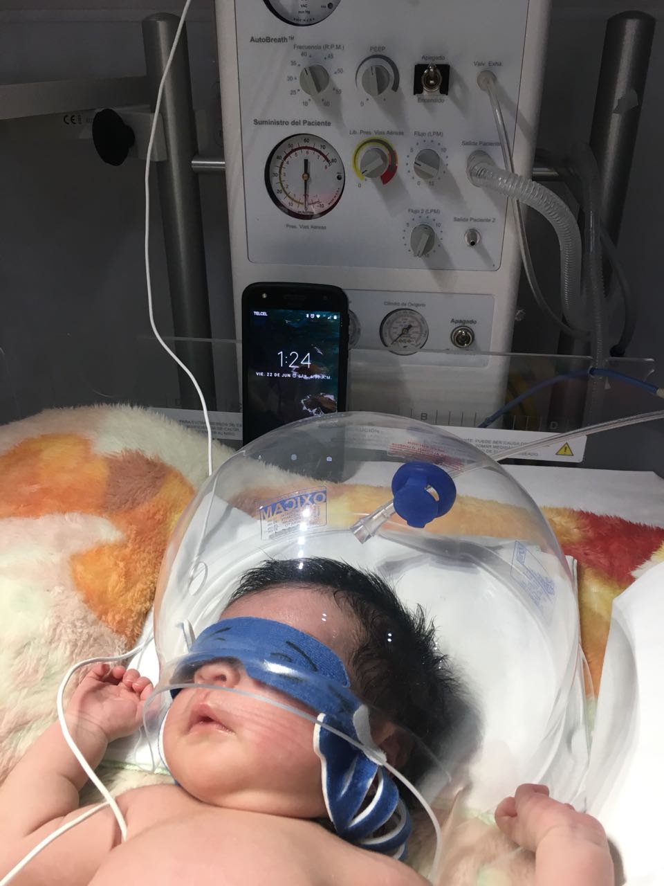 Como puede apreciarse en las imágenes proporcionadas por el nosocomio que anexamos, se observa a un infante haciendo uso del casco concentrador de oxígeno. Tal es la autenticidad de la fotografía que en ella se ve un teléfono celular con la fecha y hora, lo cual ratifica la falsedad de las imágenes proporcionadas durante la rueda de prensa del ex gobernador.