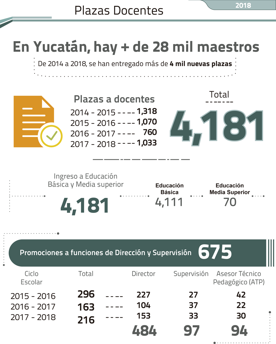 De 2014 a la fecha son cuatro mil 181 plazas laborales entregadas a maestras y maestros, lo que equivale al 14 por ciento del total de la plantilla en Yucatán.