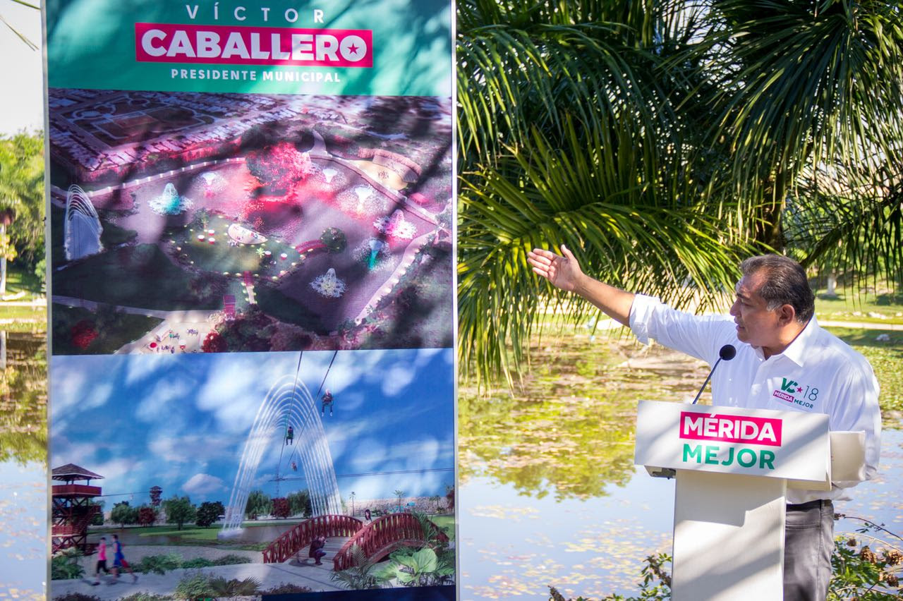 Con el fin de recuperar los espacios públicos, potencializarlos en grandes áreas temáticas de convivencia familiar y entretenimiento, el candidato del PRI a la alcaldía de Mérida, Víctor Caballero Durán propuso un nuevo concepto de parques para la capital yucateca.