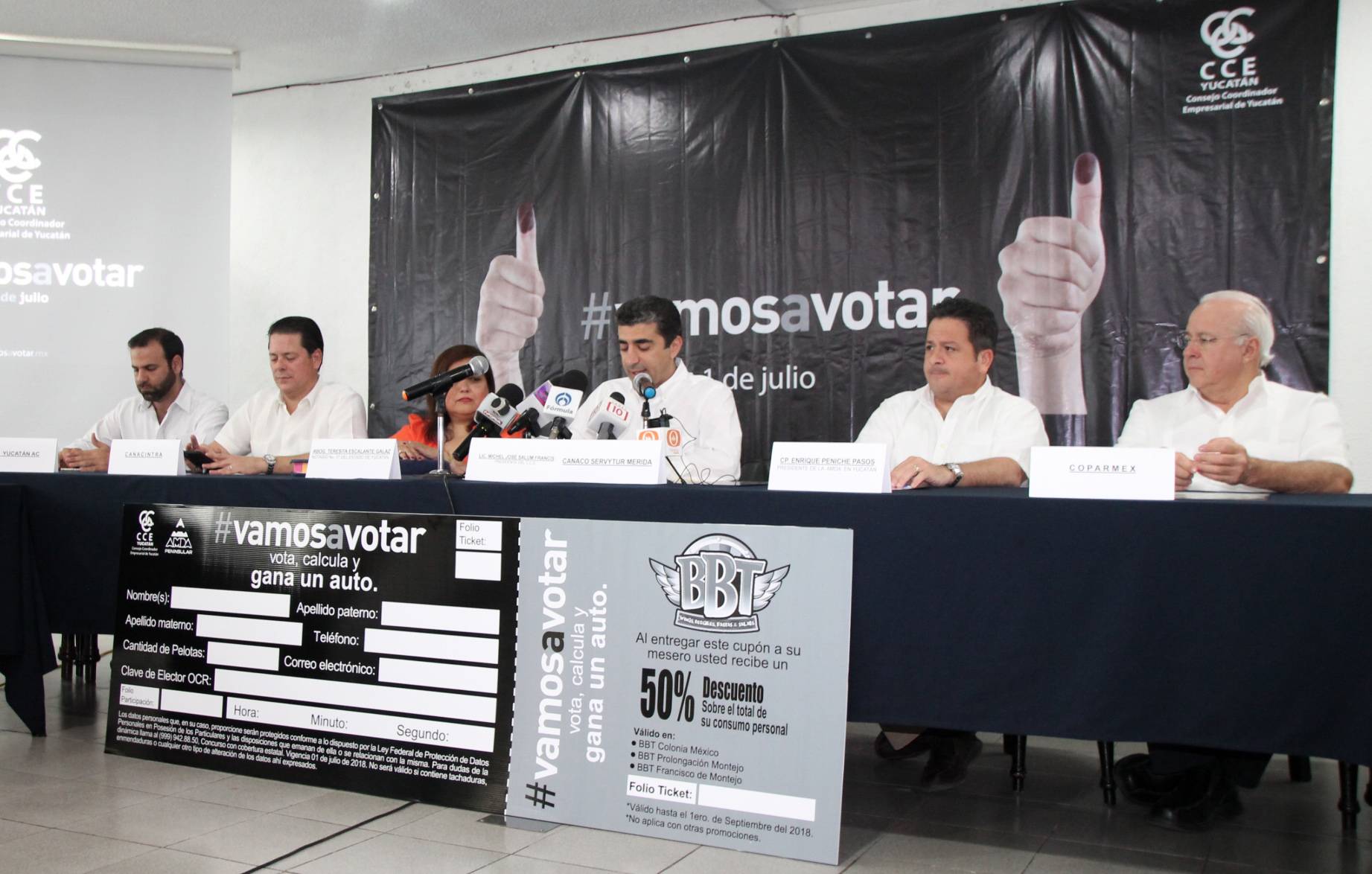 Para incentivar la participación ciudadana en la elección del domingo 1 de julio, el Consejo Coordinador Empresarial (CCE) de Yucatán dará la oportunidad a los yucatecos que voten de entrar a la dinámica “Vota, calcula y gana”, para ganarse uno de 10 vehículos ultimo modelos, así como descuentos en diversos negocios afiliados a las diversas cámaras empresariales de la localidad.